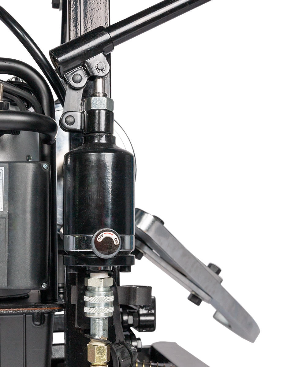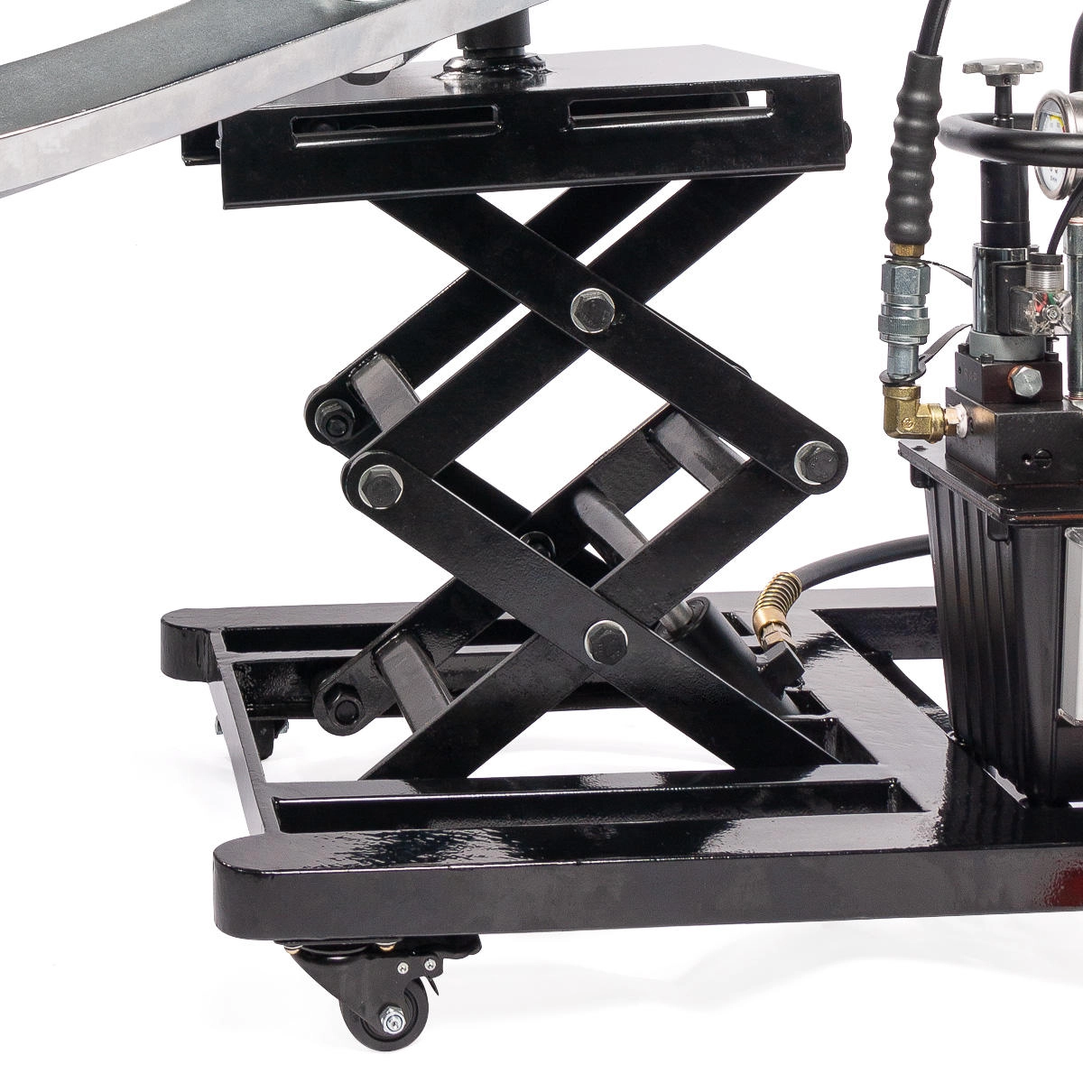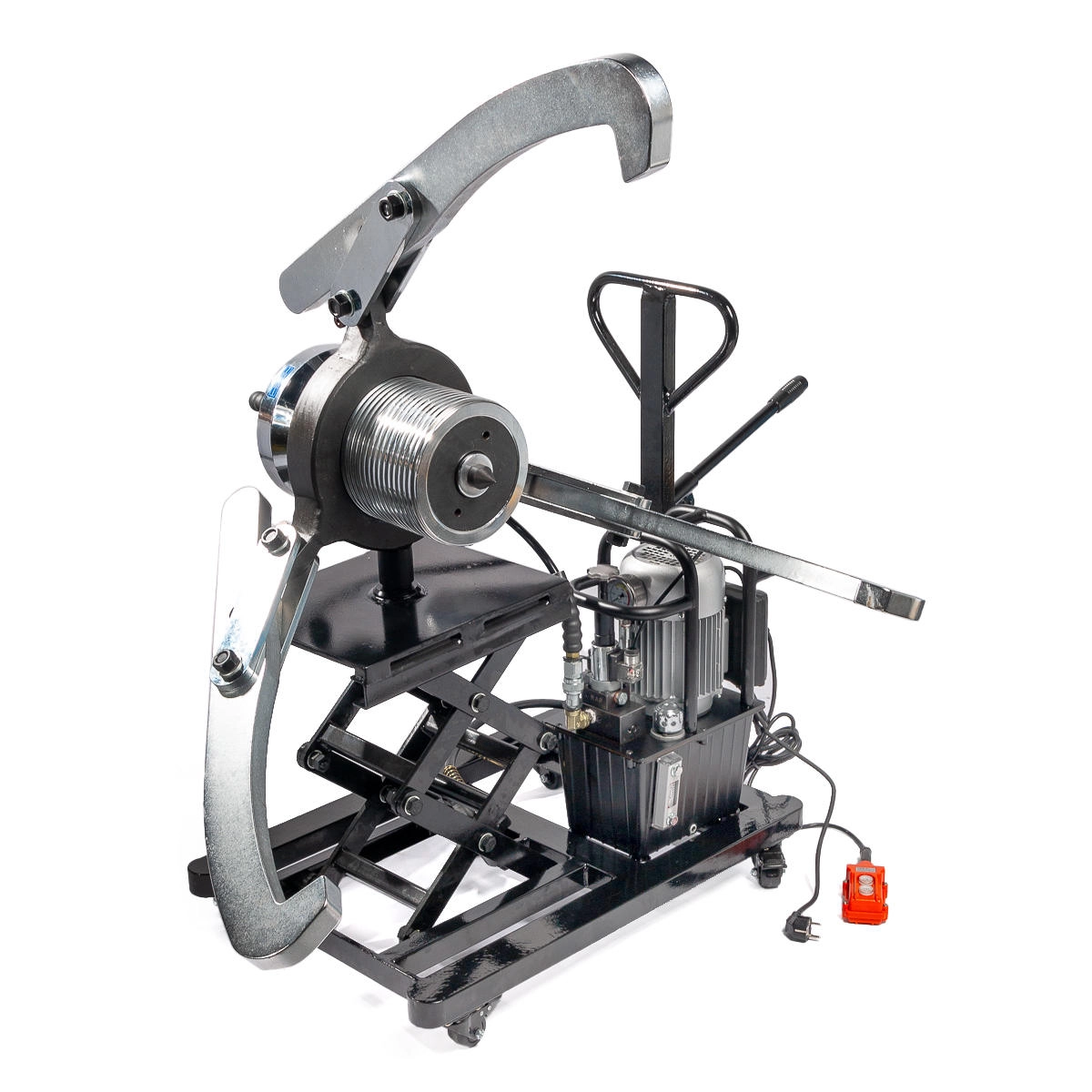 - Транспортировочная тележка из прочного стального профиля на колесных опорах и гидравлическим подъемником для регулировки высоты съемника