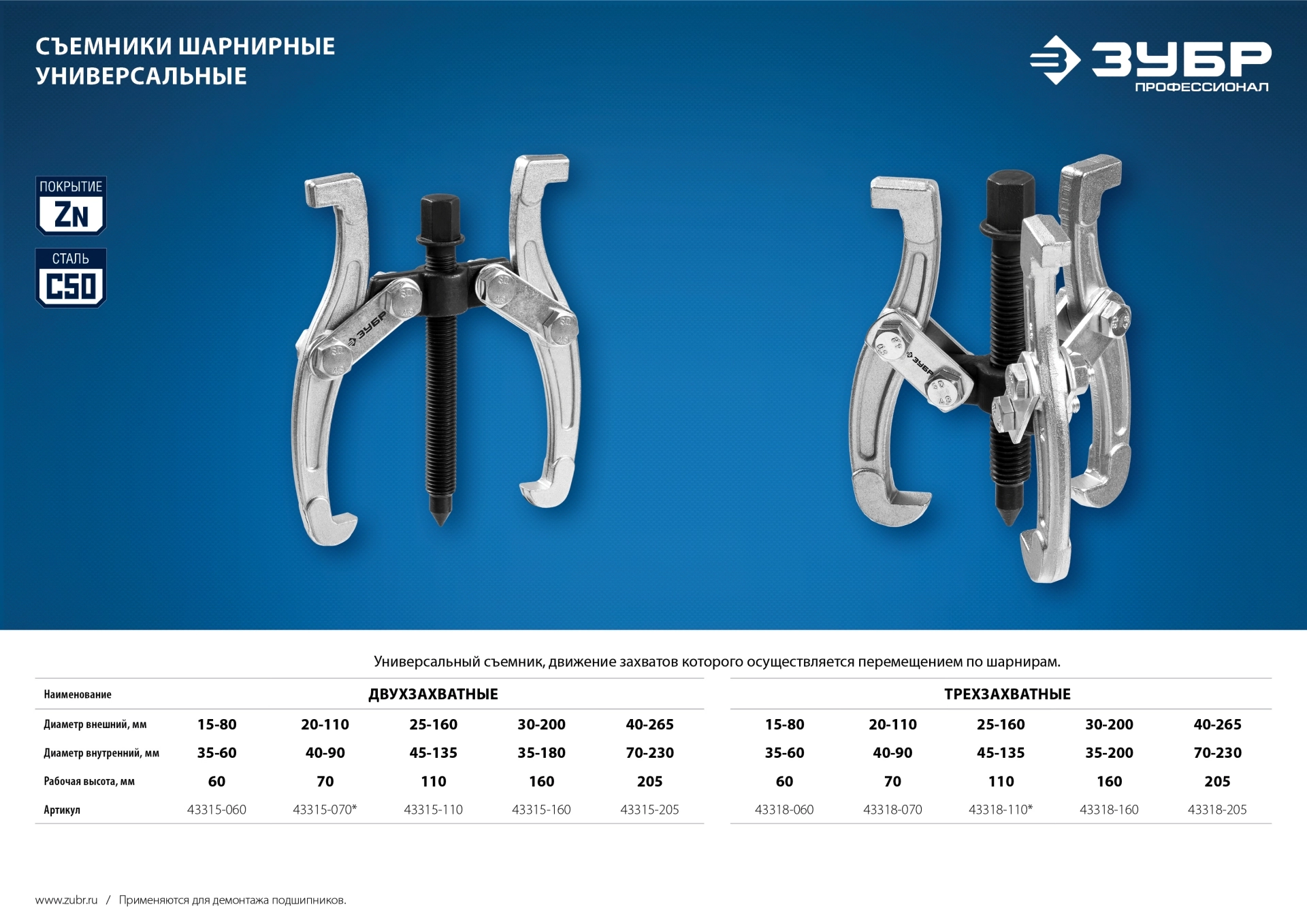 ПроизводителиСъемник шарнирный 2-захватный, 70 мм, Профессионал 43315-070 (43315-070) ЗУБР
