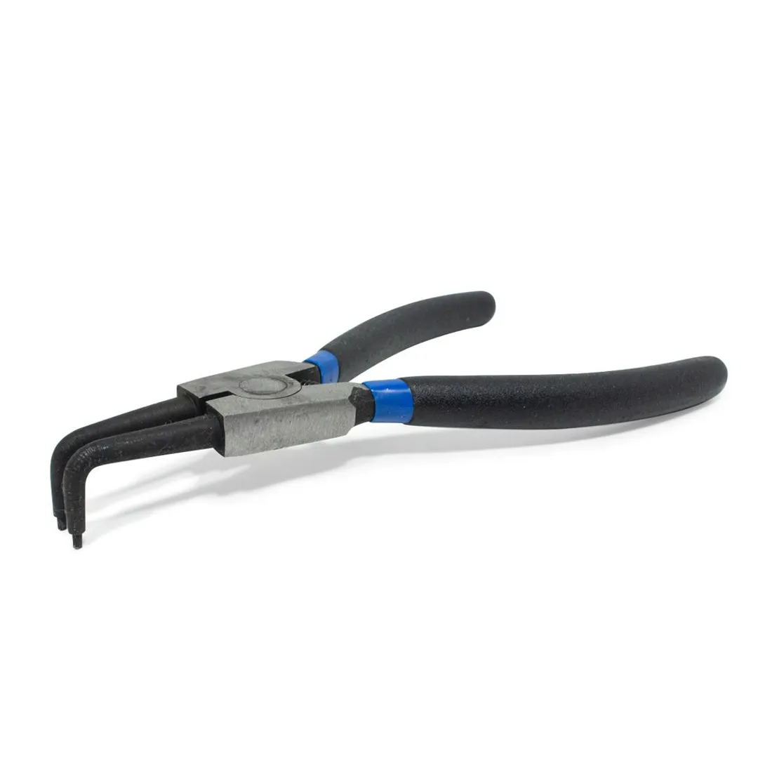 Съемник для внутренних стопорных колец позволяет быстро осуществлять демонтаж и монтаж пружинных колец. Работает на разжатие. Имеет удобные эргономичные прорезиненные ручки. Снабжён возвратной пружиной. Рабочие захваты имеют изогнутую форму (90°) и утоньшения для удобства использования. Защищён от коррозии Съёмник изготовлен из хромованадиевой стали (CrV) с фосфатным покрытием. Общая длина съёмника в сжатом состоянии составляет 180 миллиметров.Производитель: Форсаж Лтд., Тайвань