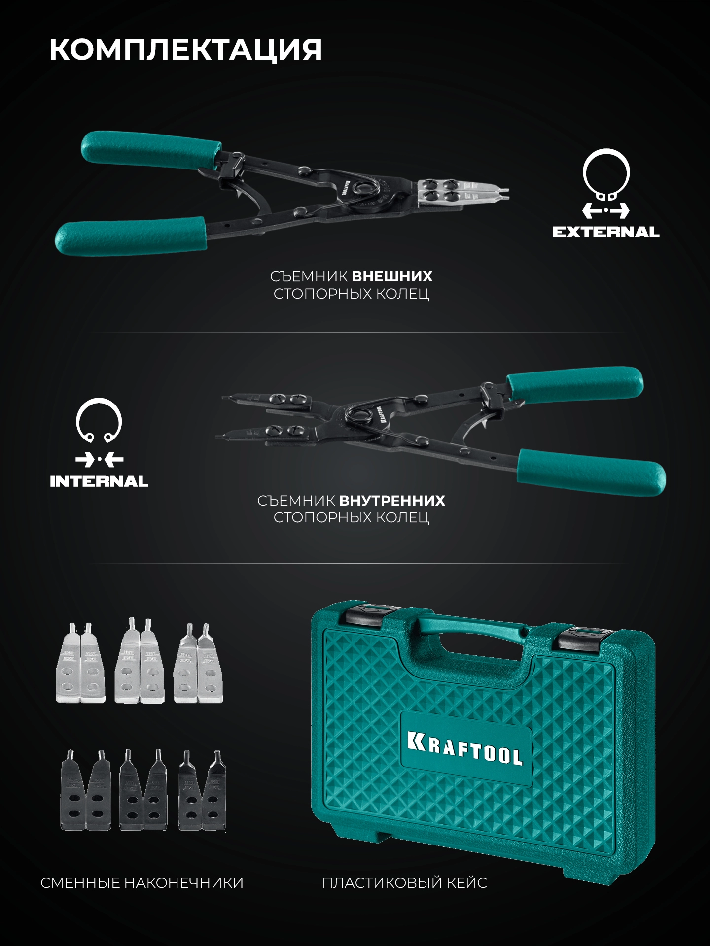 Бренд: KRAFTOOLПрофессиональный набор особомощных съемников стопорных колец (внешние и внутренние) для тяжелой и крупногабаритной техники