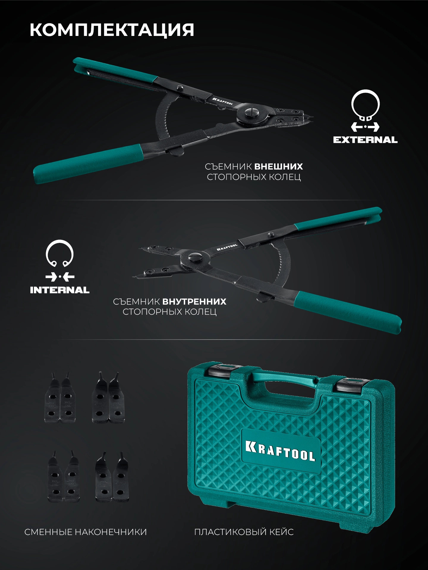 Бренд: KRAFTOOLПрофессиональный набор особомощных съемников стопорных колец (внешние и внутренние) для тяжелой и крупногабаритной техники
