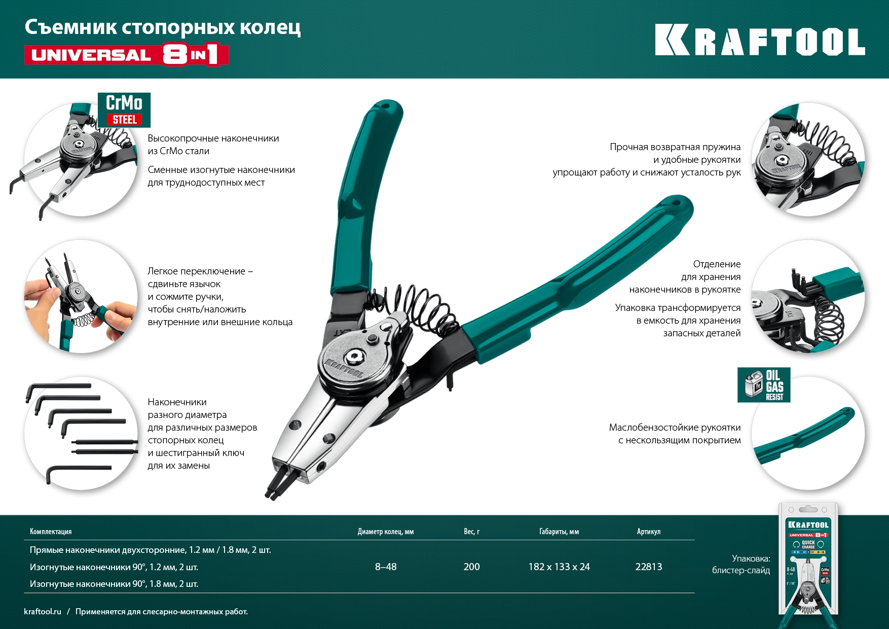 ПроизводителиСъемник стопорных колец, 8-48мм, внешний/внутренний 8-in-1 "Universal" (22813) KRAFTOOL