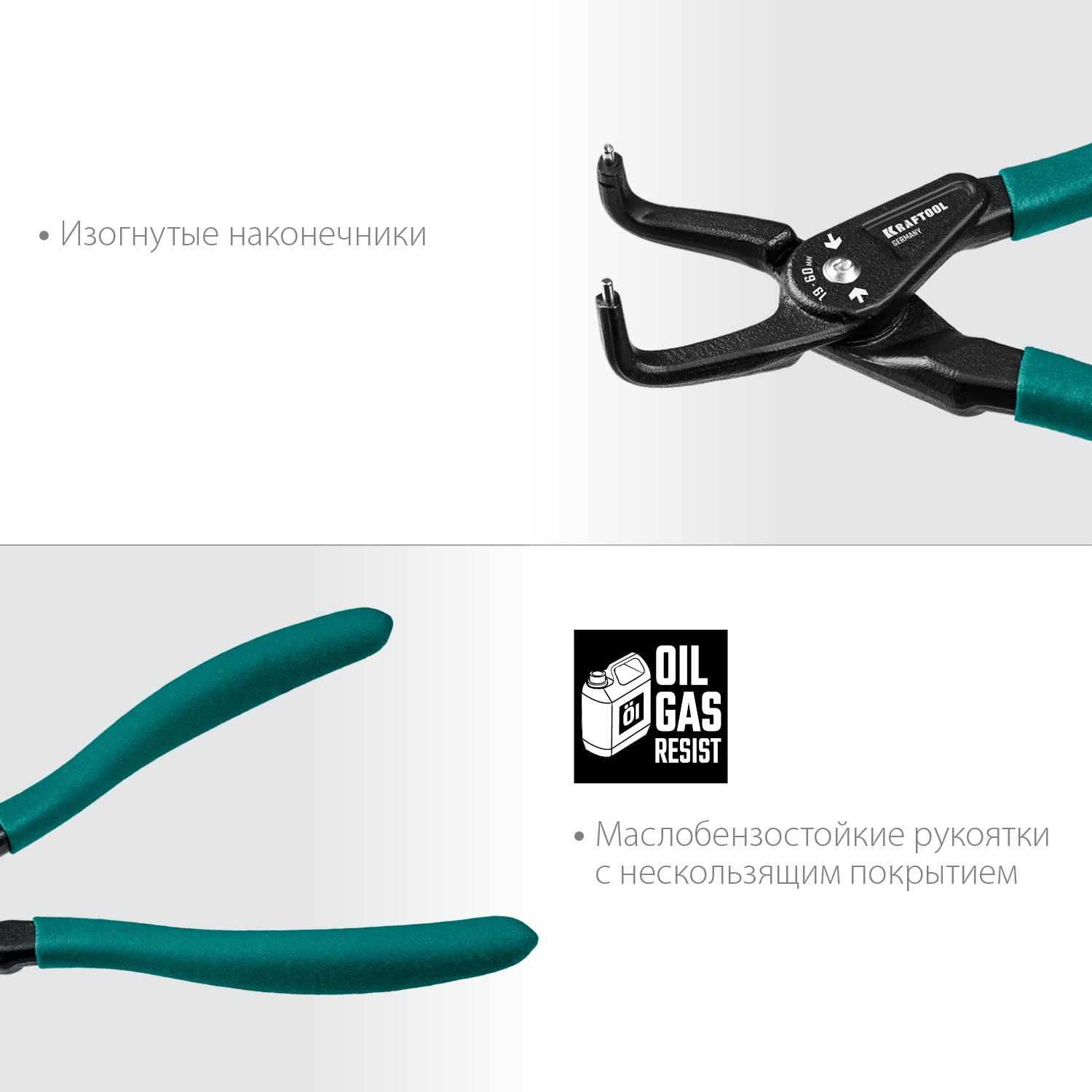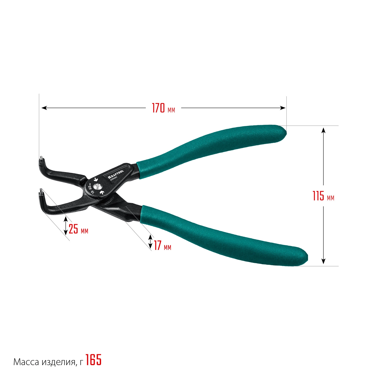 ПроизводителиСъемник стопорных колец 180мм, изогн. губки, для внутр. колец (22812-2) KRAFTOOL
