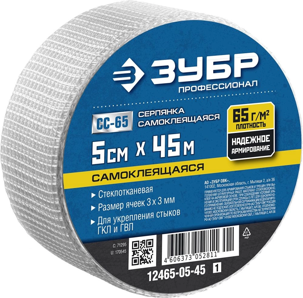 ПроизводителиЛента серпянка самоклеящаяся 50мм/45м "СС-65""Профессионал" (12465-05-45_z01) ЗУБР