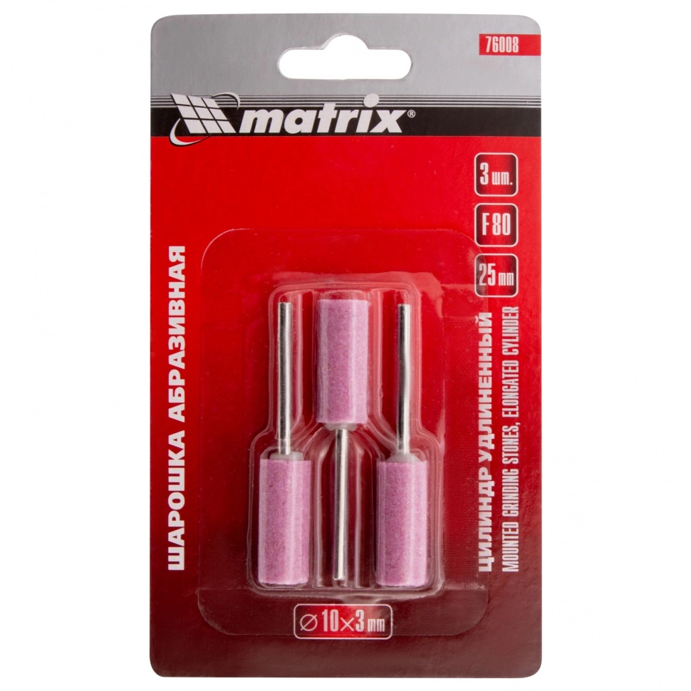 ПроизводителиШарошка абразивная (дерево,металл,стекло,пласт.), цил.удл., 10x25мм, хв.3мм, F80, 3шт (76008) MATRIX