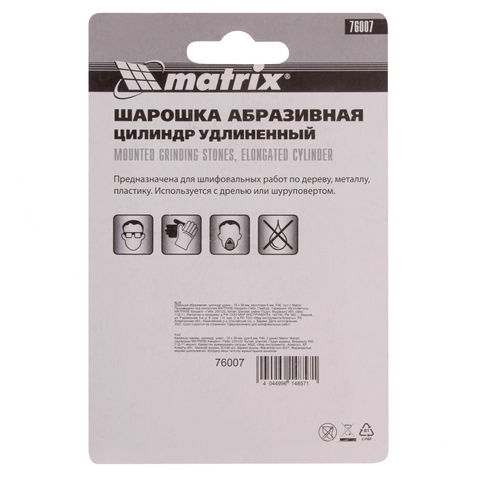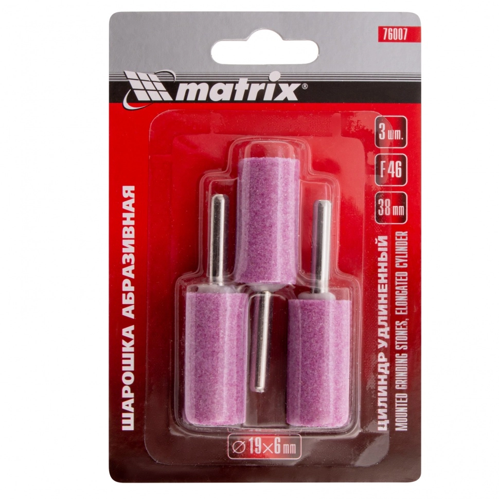 ПроизводителиШарошка абразивная (дерево,металл,стекло,пласт.), цил.удл., 19x38мм, хв.6мм, F46, 3шт (76007) MATRIX