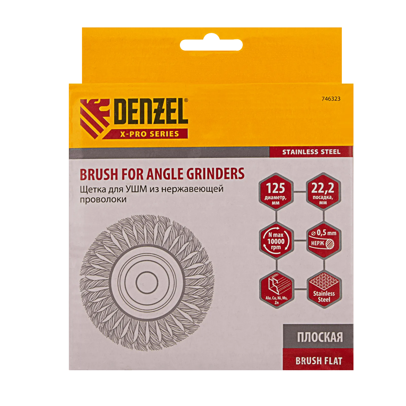 ПроизводителиЩетка дисковая (коса) d=125х22мм, нерж. провол. INOX (746323) DENZEL