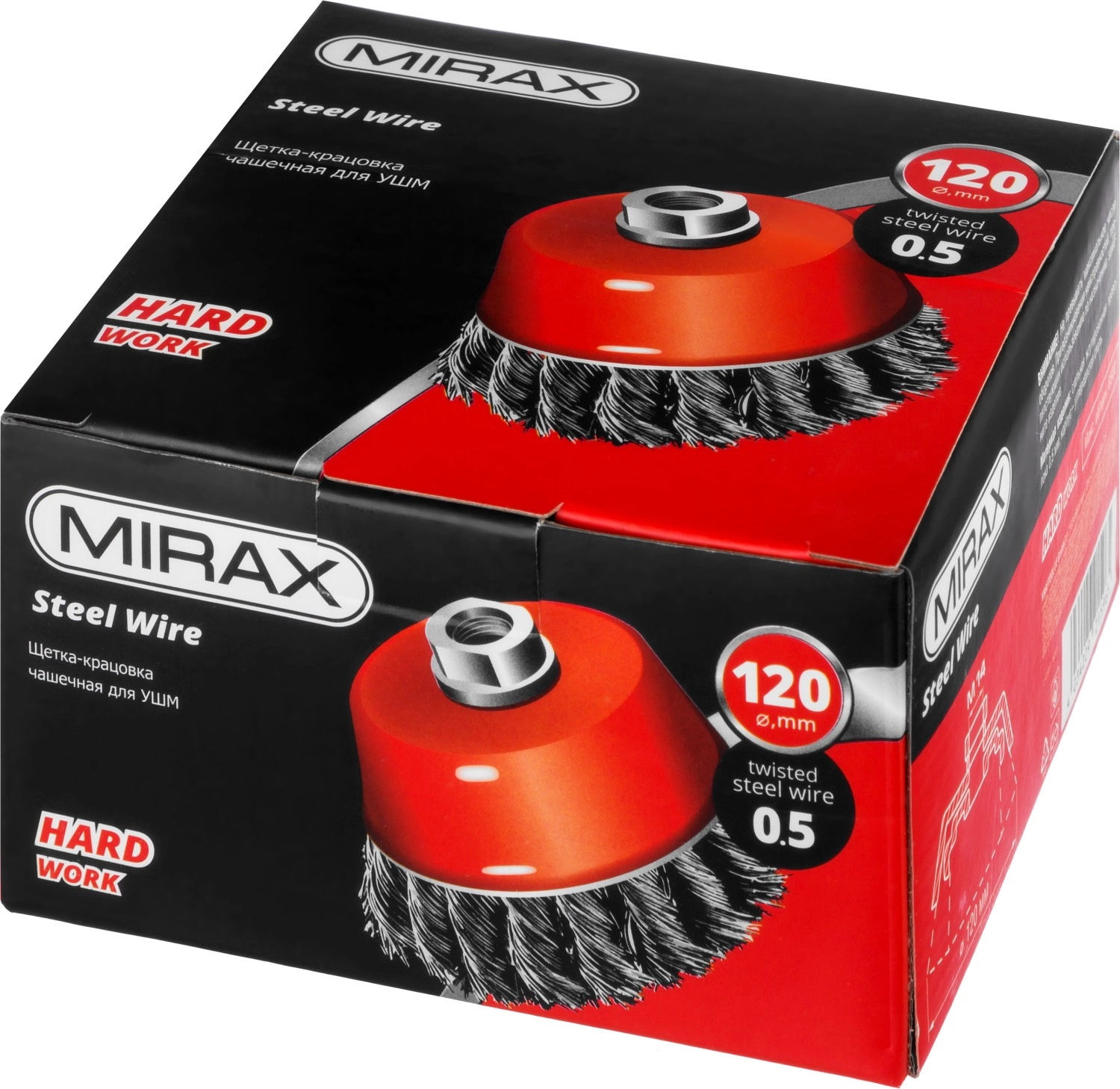 ПроизводителиЩетка-крацовка чашечная для УШМ, жгутированная стальная проволока 0,5 мм, d=120 мм, MIRAX 35104-120