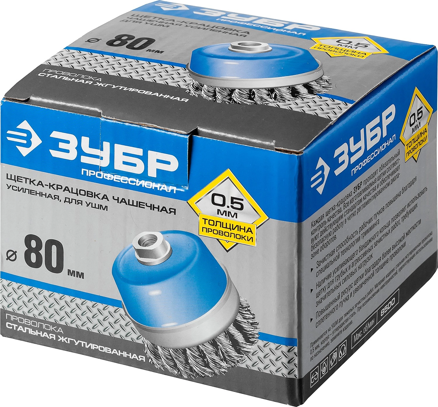 ПроизводителиЩетка чашечная усиленная (коса) d=80ммхМ14, стальн. пров. 0,5мм (3527-080_z02) ЗУБР