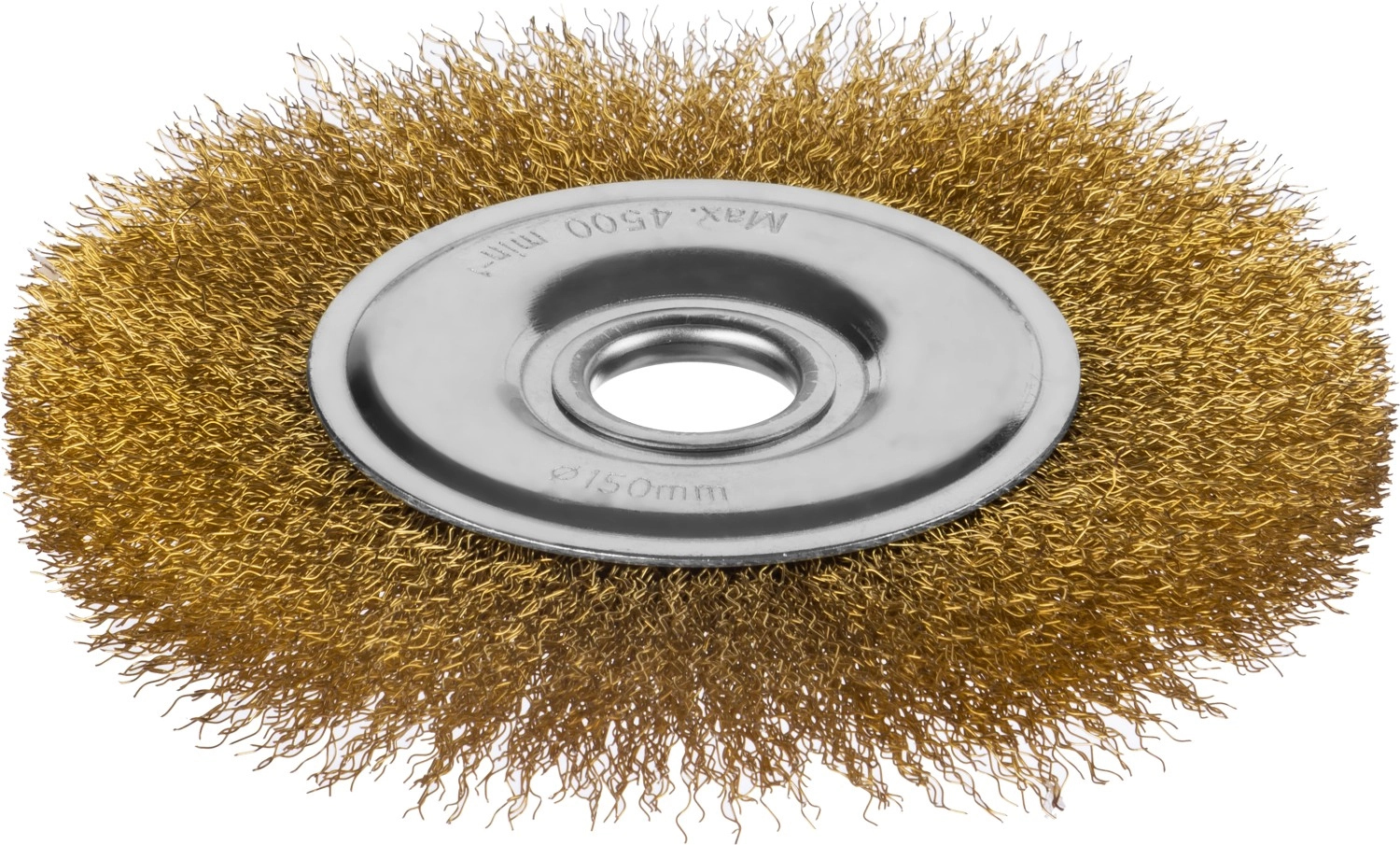 ПроизводителиЩетка дисковая для УШМ, витая стальная латунированная проволока 0,3 мм, d=150 мм, MIRAX 35141-150