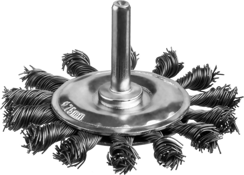 ПроизводителиЩетка дисковая для дрели, жгутированная стальная проволока 0,5 мм, d=75 мм, MIRAX 35146-075