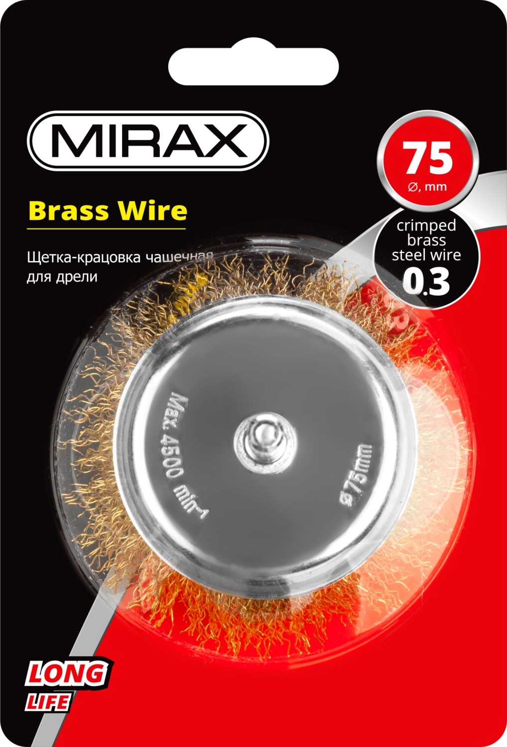 ПроизводителиЩетка чашечная для дрели, витая стальная латунированная проволока 0,3 мм, d=75 мм, MIRAX 35147-075