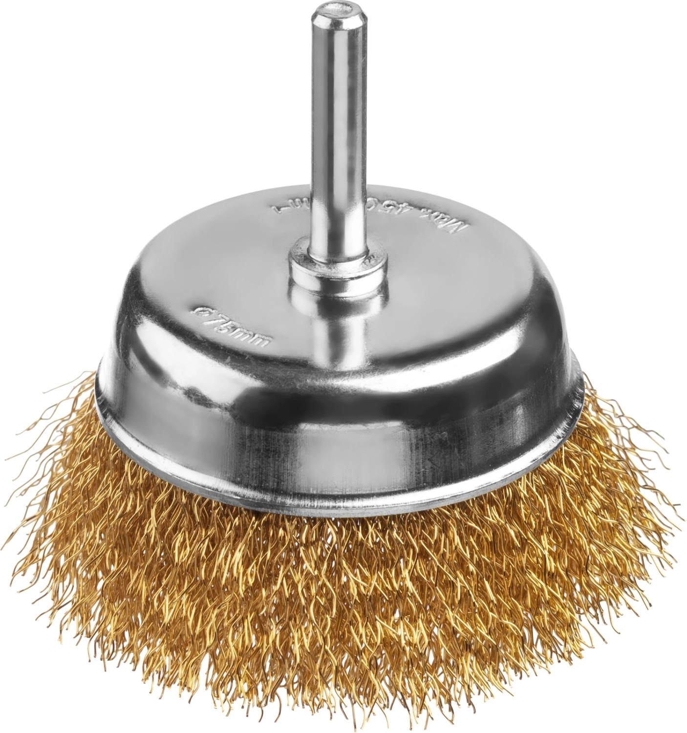 ПроизводителиЩетка чашечная для дрели, витая стальная латунированная проволока 0,3 мм, d=75 мм, MIRAX 35147-075