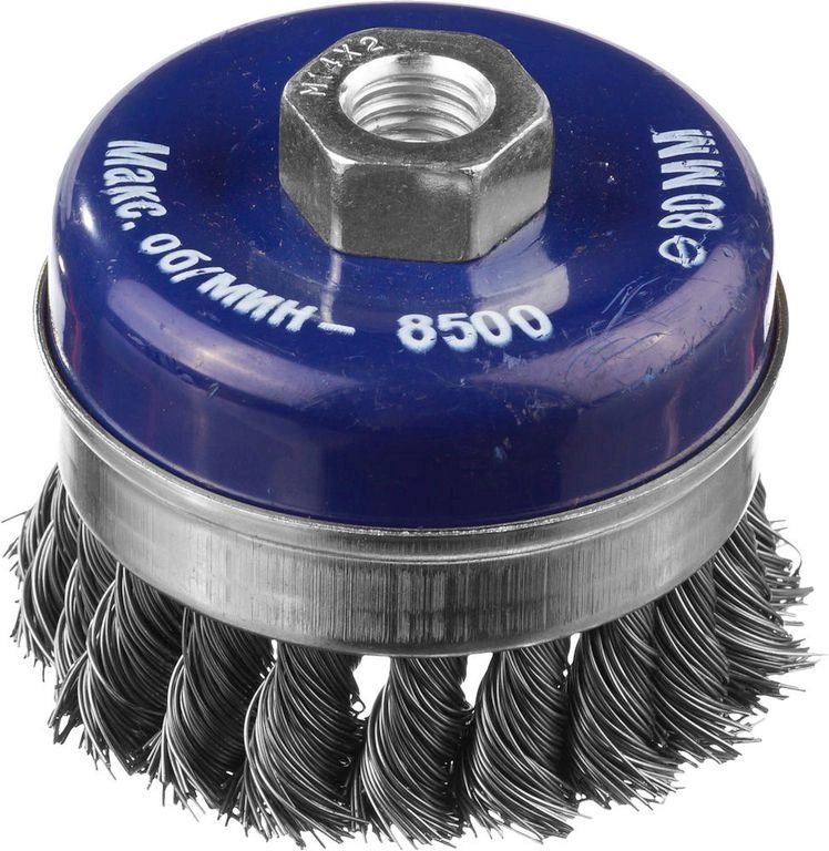 ПроизводителиЩетка чашечная усиленная (коса) d=80ммхМ14, стальн. пров. 0,5мм (35106-080) DEXX