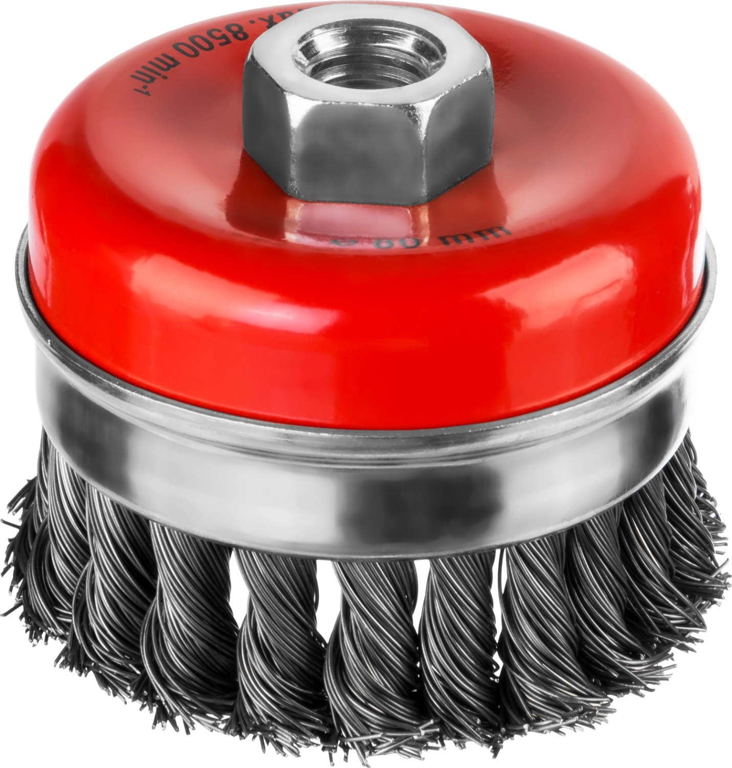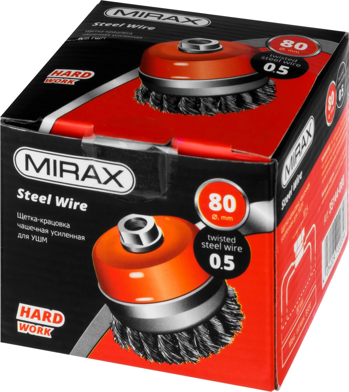 ПроизводителиЩетка чашечная усиленная для УШМ, жгутированная стальная проволока 0,5 мм, d=80 мм, MIRAX 35144-080