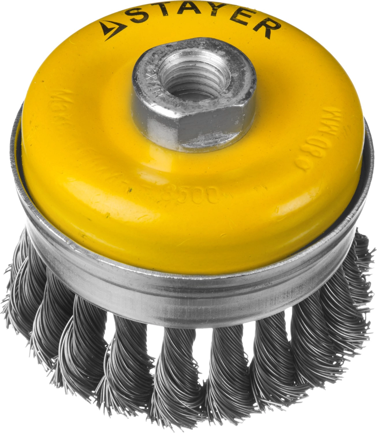 ПроизводителиЩетка чашечная усиленная (коса) 80ммхМ14, стальн. пров. 0,5мм "PROFESSIONAL" (35137-080) STAYER