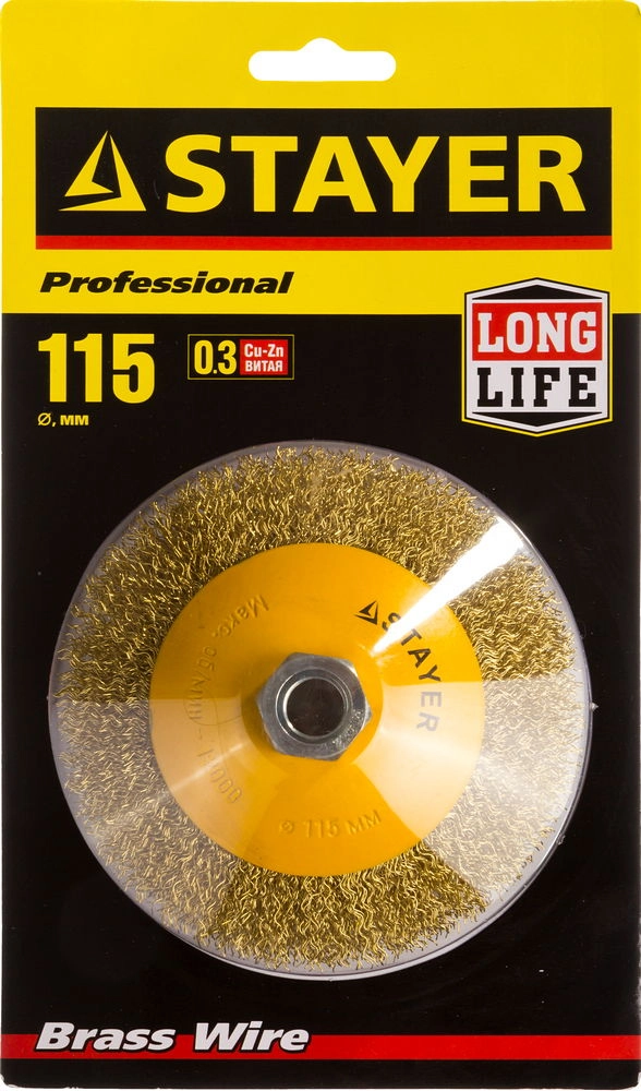 ПроизводителиЩетка коническая (гофр) 115ммхМ14, стальн. латун. пров. 0,3мм "PROFESSIONAL" (35133-115) STAYER