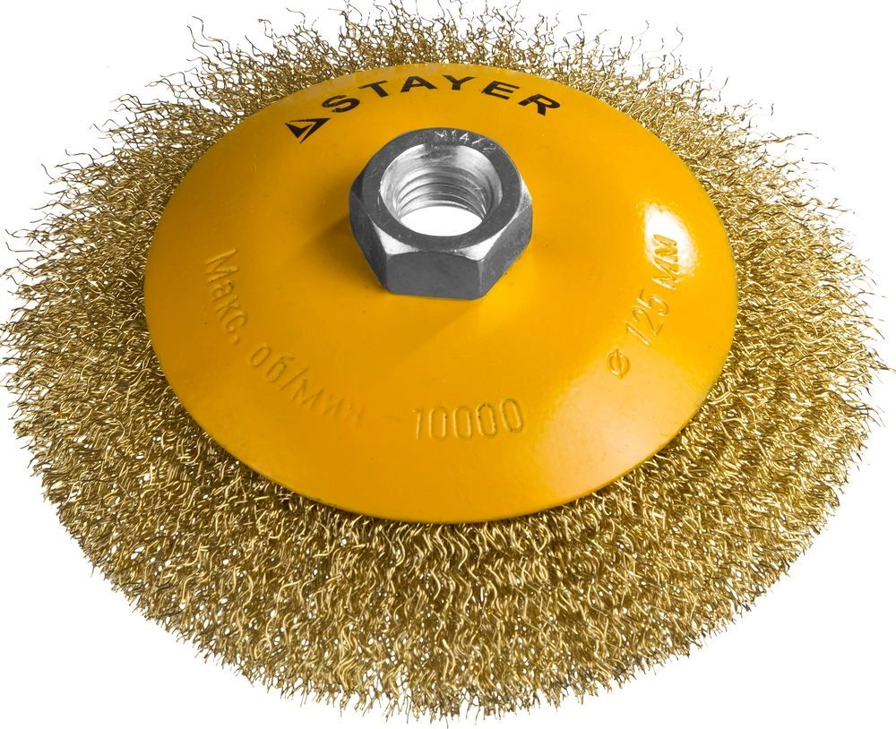 ПроизводителиЩетка коническая (гофр) 125ммхМ14, стальн. латун. пров. 0,3мм "PROFESSIONAL" (35133-125) STAYER