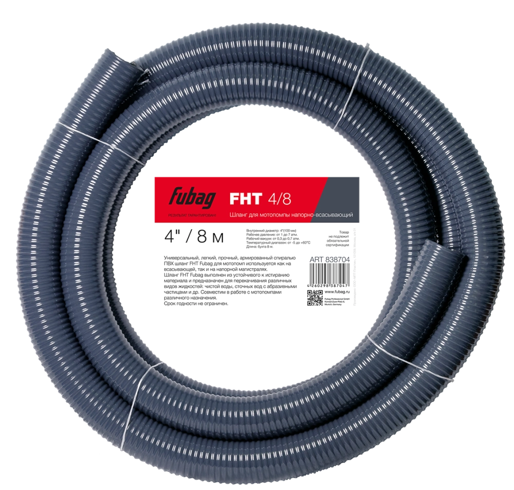 ПроизводителиШланг для мотопомпы FHT 4/8м напорновсасывающий (838704) FUBAG
