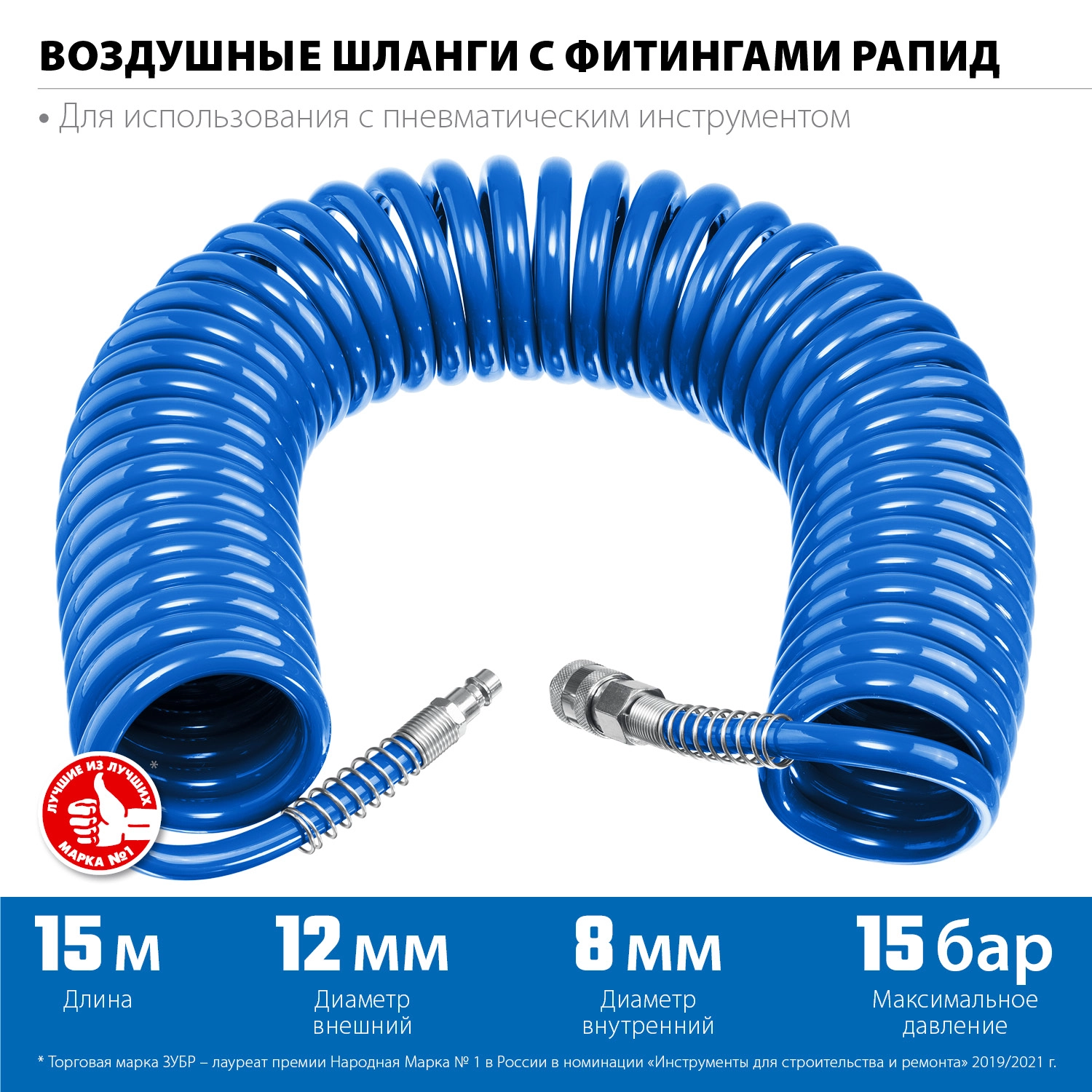 ПроизводителиШланг спиральный для воздуха с фитингами 8х12мм, 15м, 15 бар (PU)(6472-15) RAPID