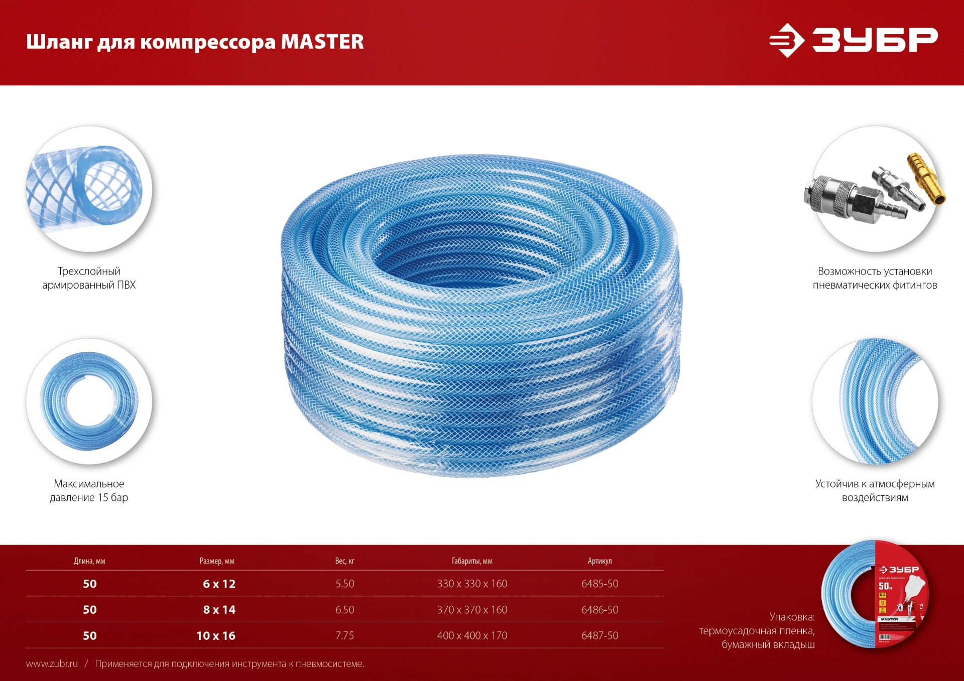 ПроизводителиШланг воздушный для компрессора 50 м, 6 х 12 мм, 15 бар (6485-50) ЗУБР