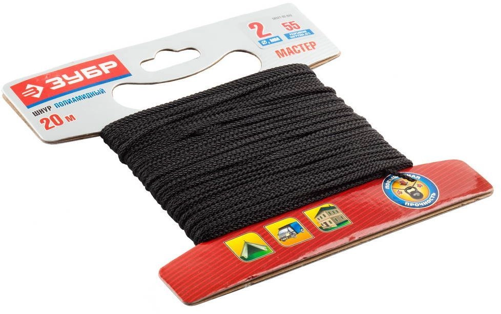 ПроизводителиШнур полиамидный, плетеный, повышенной нагрузки, без сердечника, черный, d2, 20м (50321-02-020) ЗУБР
