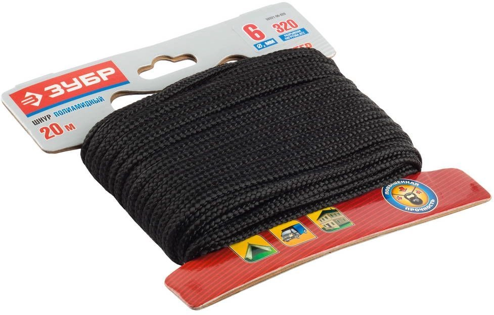 ПроизводителиШнур полиамидный, плетеный, повышенной нагрузки, без сердечника, черный, d6, 20м (50321-06-020) ЗУБР