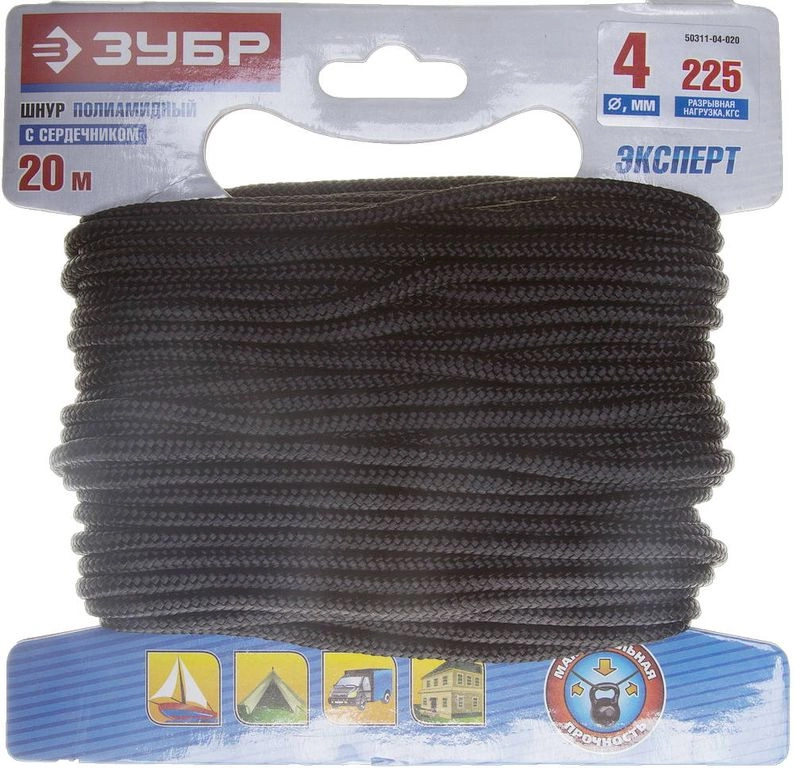 ПроизводителиШнур полиамидный, плетеный, повышенной нагрузки, с сердечником, черный, d 4, 20м (50311-04-020) ЗУБР