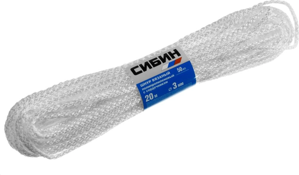 ПроизводителиШнур вязаный полипропиленовый СИБИН с сердечником, белый, длина 20 метров, диаметр 3 мм