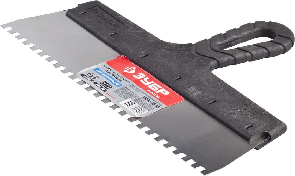 ПроизводителиШпатель зубчатый нерж. фасад. 300 мм/ 6 мм, пласт. рук. "МАСТЕР" (10078-30-06) ЗУБР