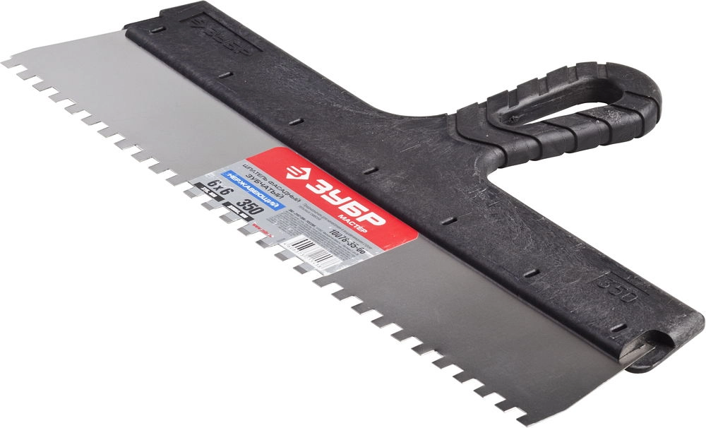 ПроизводителиШпатель зубчатый нерж. фасад. 350 мм/ 6 мм, пласт. рук. "МАСТЕР" (10078-35-06) ЗУБР