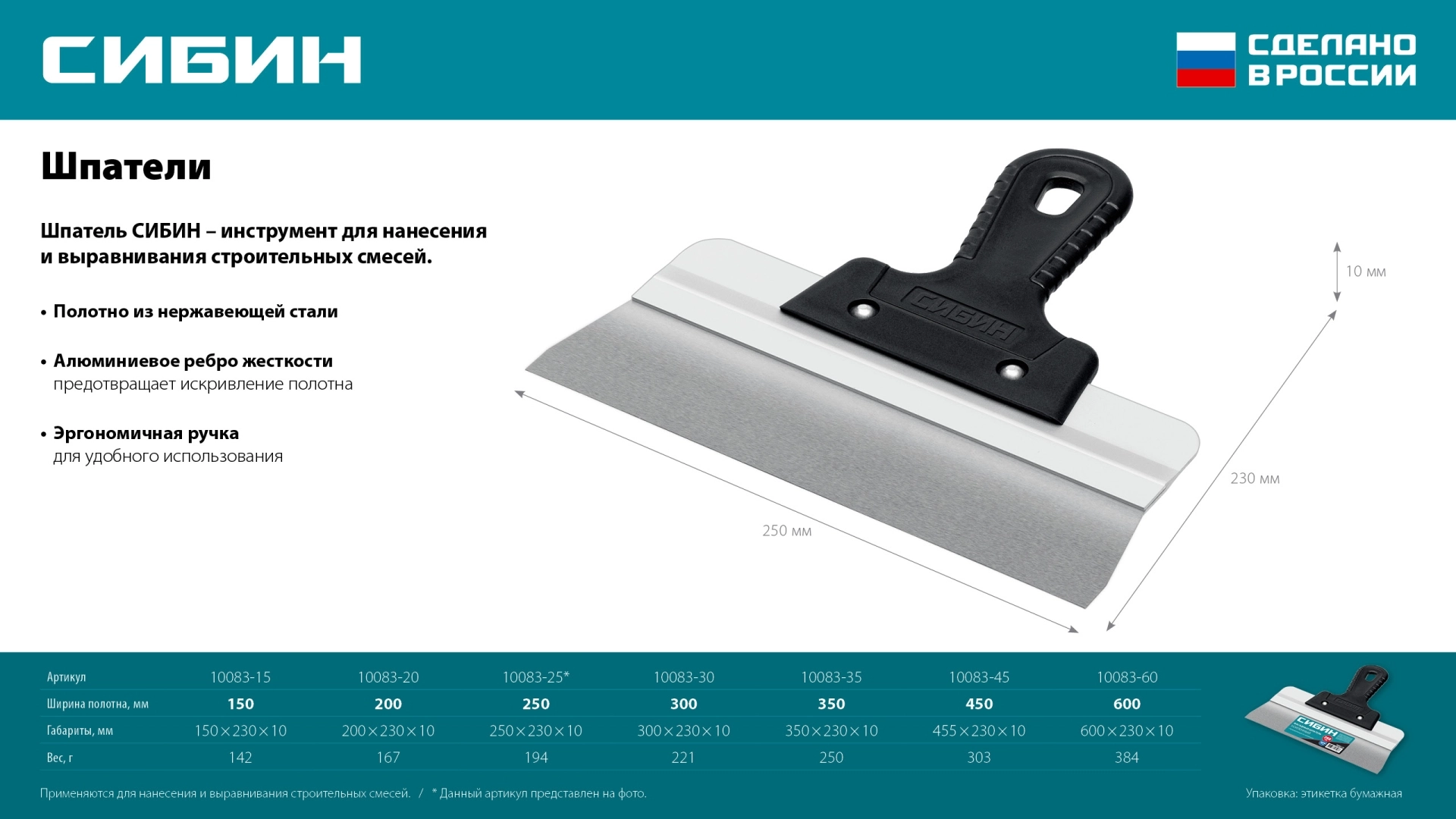 ПроизводителиШпатель нерж. фасад. 250 мм, усиленный, алюм. направляющая (10083-25) СИБИН