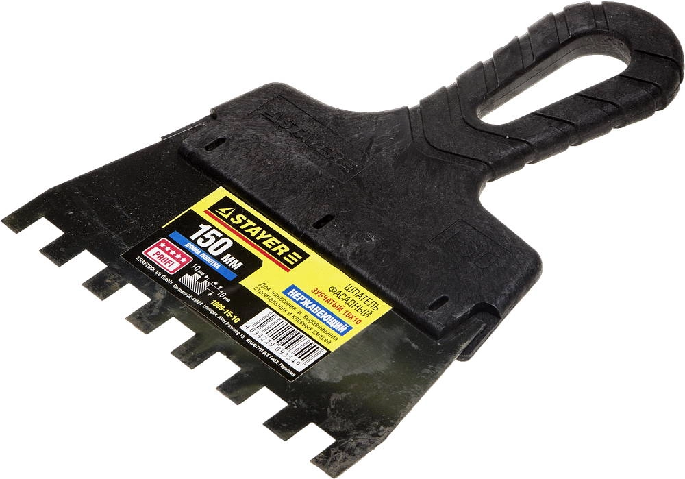 ПроизводителиШпатель зубчатый нерж. фасад. 150 мм/ 10 мм, пласт. рук. "PROFESSIONAL" (1009-15-10) STAYER