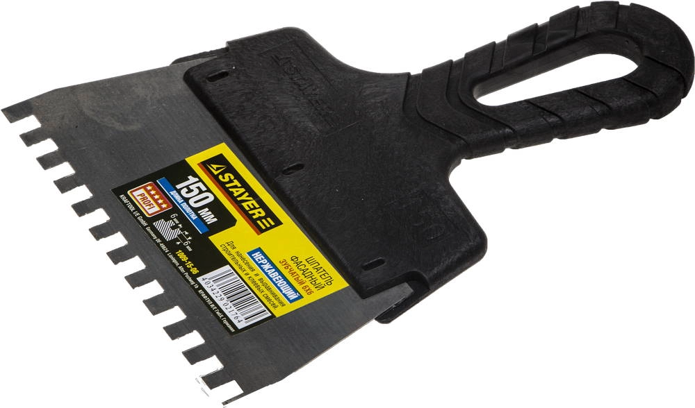 ПроизводителиШпатель зубчатый нерж. фасад. 150 мм/ 6 мм, пласт. рук. "PROFESSIONAL" (1009-15-06) STAYER