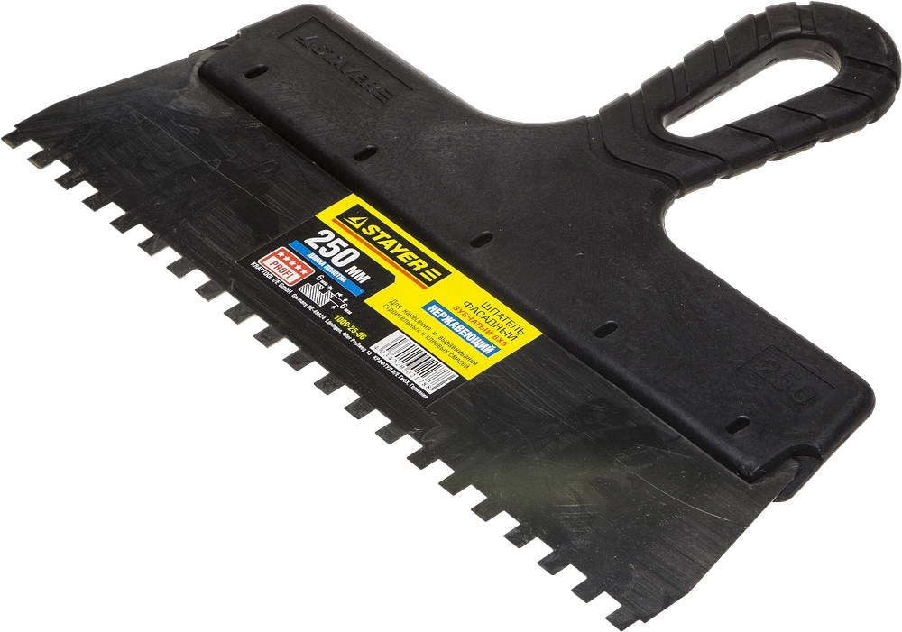 ПроизводителиШпатель зубчатый нерж. фасад. 250 мм/ 6 мм, пласт. рук. "PROFESSIONAL" (1009-25-06) STAYER