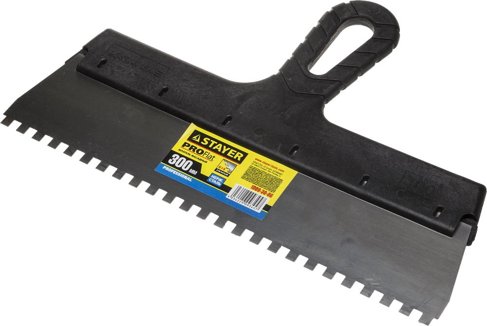 ПроизводителиШпатель зубчатый нерж. фасад. 300 мм/ 6 мм, пласт. рук. "PROFESSIONAL" (1009-30-06) STAYER