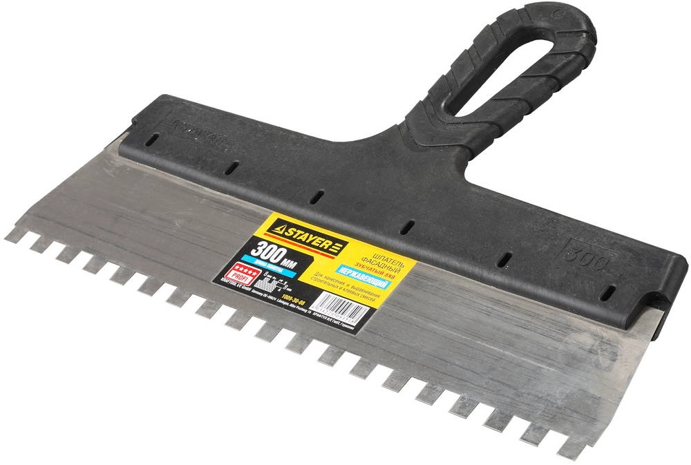 ПроизводителиШпатель зубчатый нерж. фасад. 300 мм/ 8 мм, пласт. рук. "PROFESSIONAL" (1009-30-08) STAYER