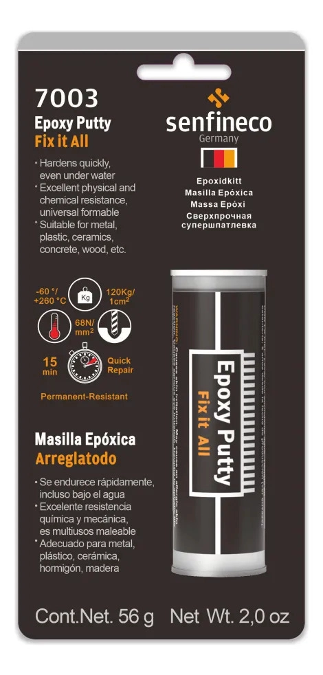 Senfineco Epoxy Putty — двухкомпонентная cупершпатлевка на основе эпоксидной смолы для быстрого ремонта с долговременным эффектом. Заполняет отверстия, царапины, трещины, полости и вмятины. Легко смешивается руками и принимает любую форму. Разработана для ремонта поверхностей из любых металлов и пластиков. С её помощью можно устранить течи бензобака, радиатора, масляного поддона, бочек, труб и т.д. Применима под водой. Сохраняет свои свойства до 260 °С. Устойчива к маслам, растворителям, воде и многому другому. Свойства : – отличная устойчивость к химическому и механическому воздействию – быстро затвердевает при любых условиях, даже под водой – долговечна – после окончательного затвердевания возможна любая механическая обработка со снятием стружки (сверление, распиливание, нарезание резьбы, циклёвка, шлифование и т.д.), а затем окраска или лакировка – не содержит асбест и является электроизолятоПроизводитель: Сервис Кар Технолоджи Вертрибс ГмбХ. Хазенкамп 4, 22880 Ведель, Гамбург, Германия