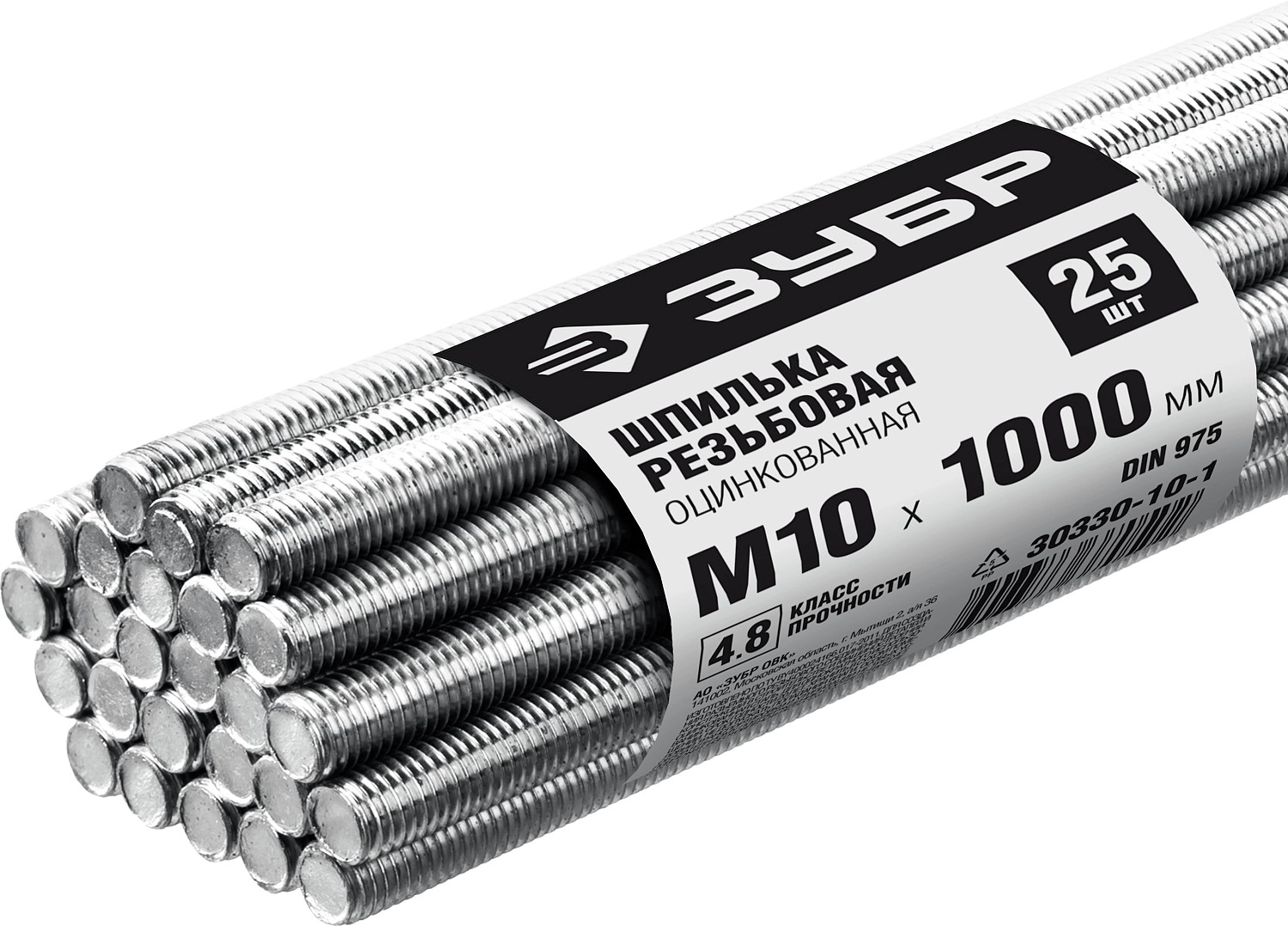 ПроизводителиШпилька резьбовая М10x1000 DIN 975, кл.пр.4.8, оцинкованная, 25шт. (30330-10-1) ЗУБР