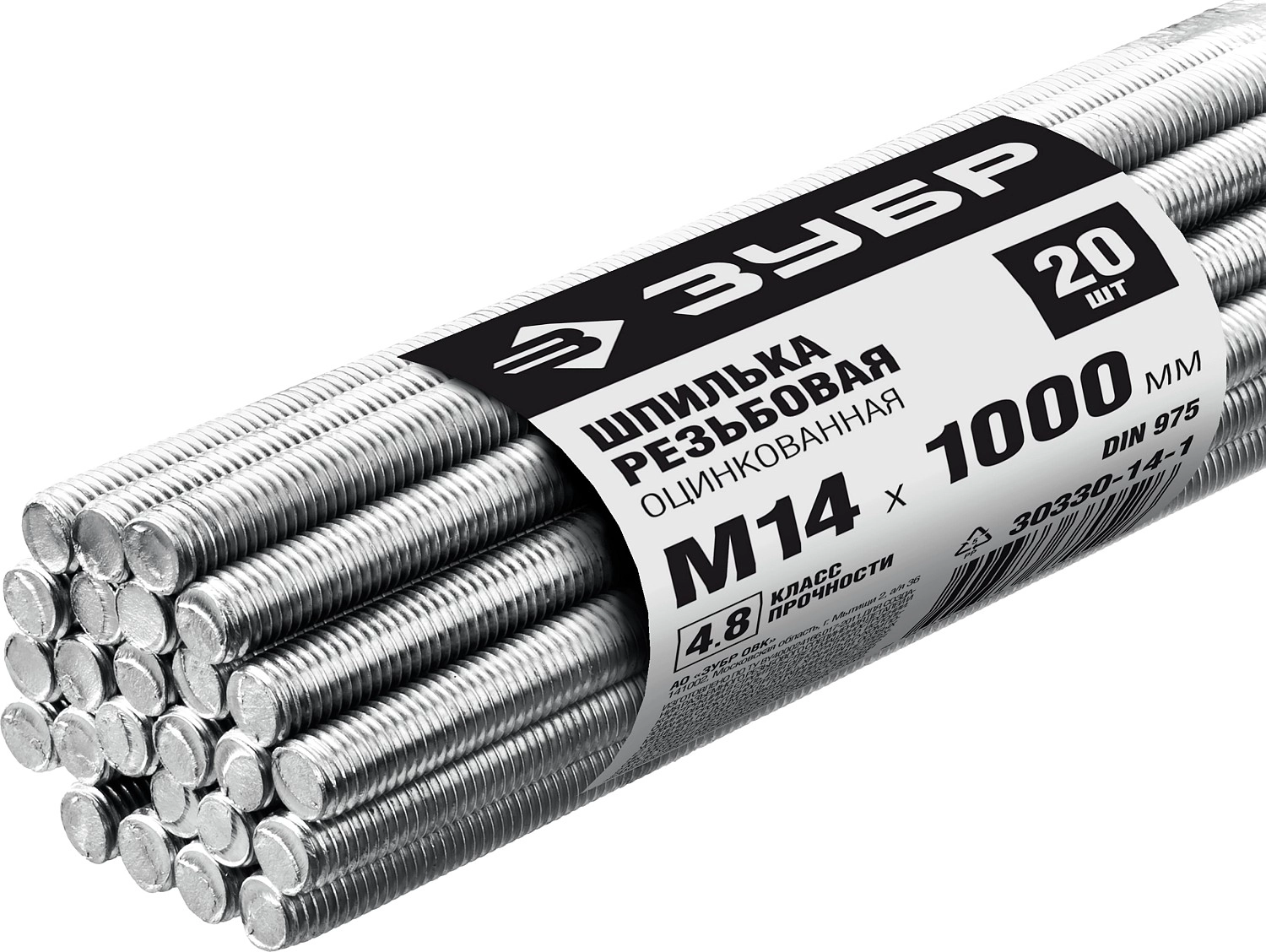 ПроизводителиШпилька резьбовая М14x1000 DIN 975, кл.пр.4.8, оцинкованная, 20шт. (30330-14-1) ЗУБР