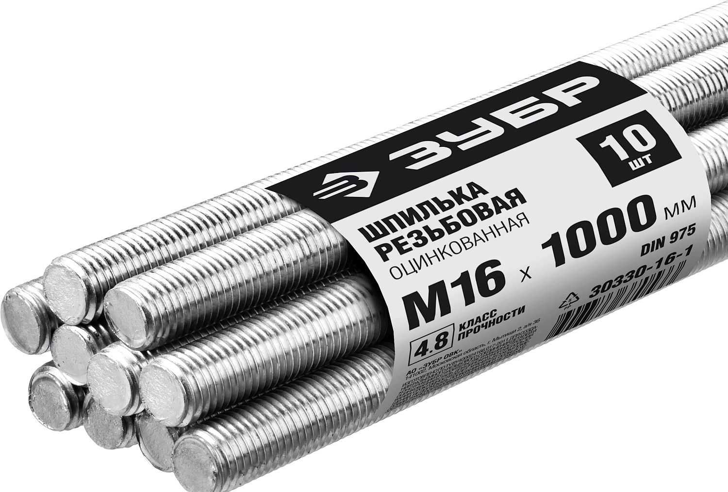 ПроизводителиШпилька резьбовая М16x1000 DIN 975, кл.пр.4.8, оцинкованная, 10шт. (30330-16-1) ЗУБР