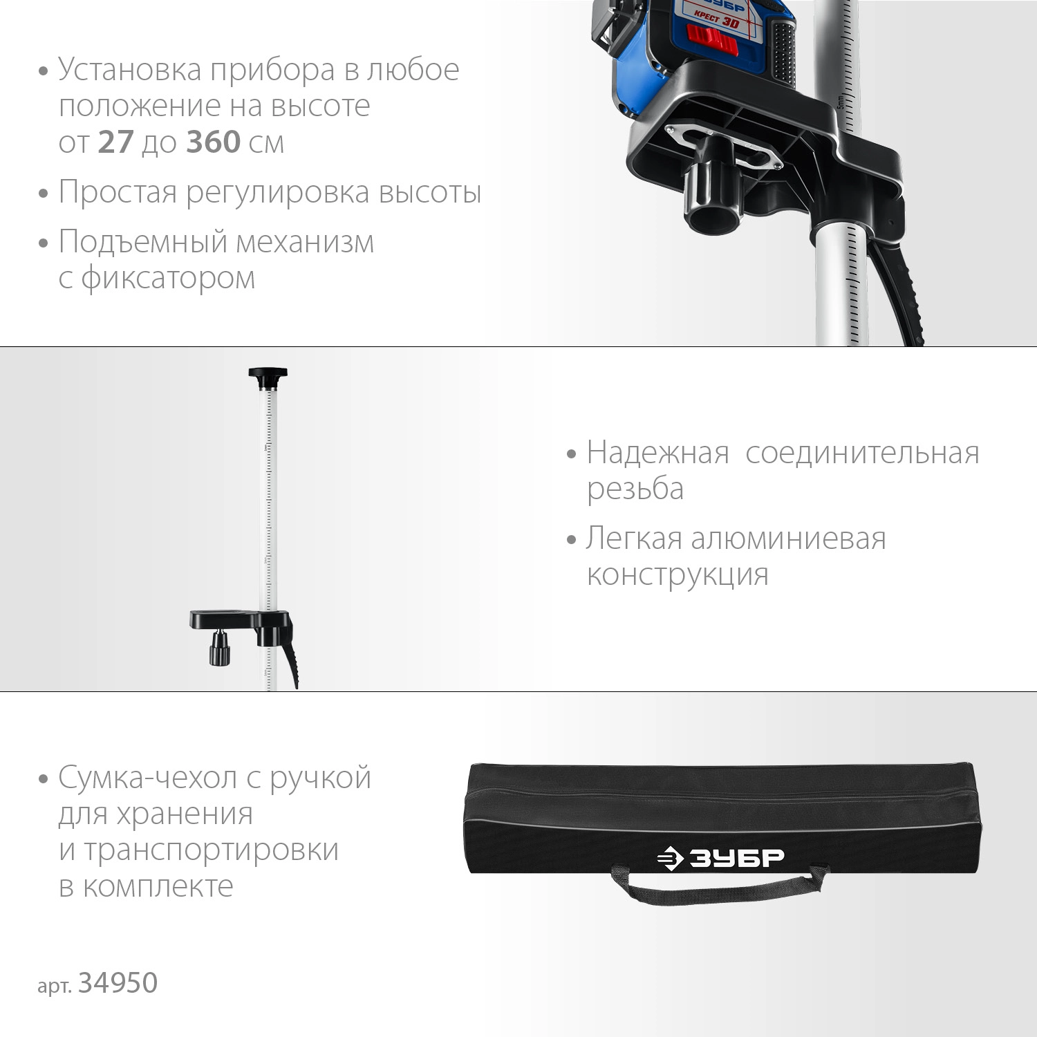 Профессиональный инструмент для работы с лазерным. оптическим и фотоинструментом. там где требуется разметка на большой высоте. Выполнена из алюминиевого сплава. благодаря чему имеет небольшой вес. А за счёт разборной конструкции штангу легко носить и легко с ней работать.