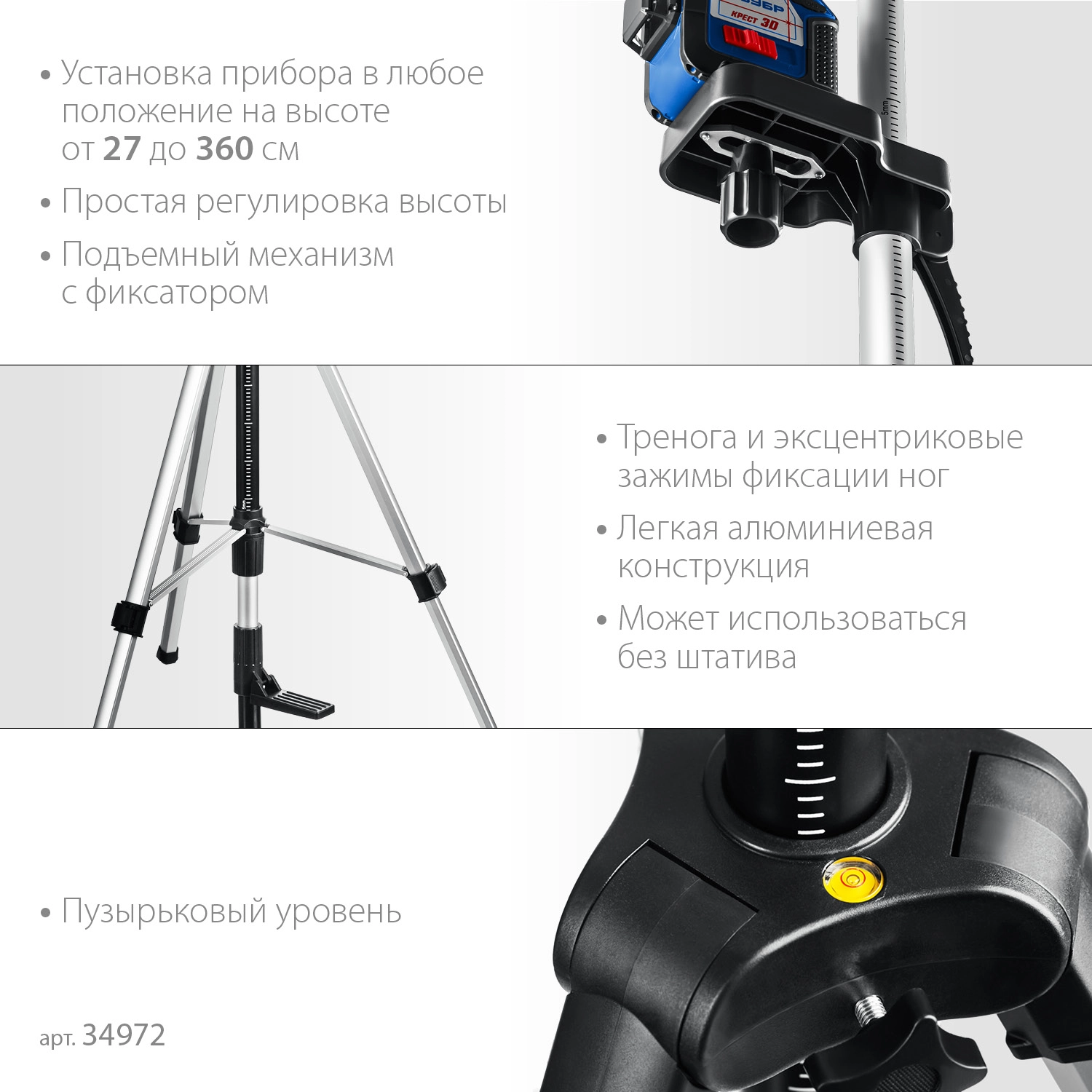 ПроизводителиШтанга-штатив элевационная, распорная, с треногой, резьба 5/8", высота 27-360мм "ШШ-4" (34972) ЗУБР