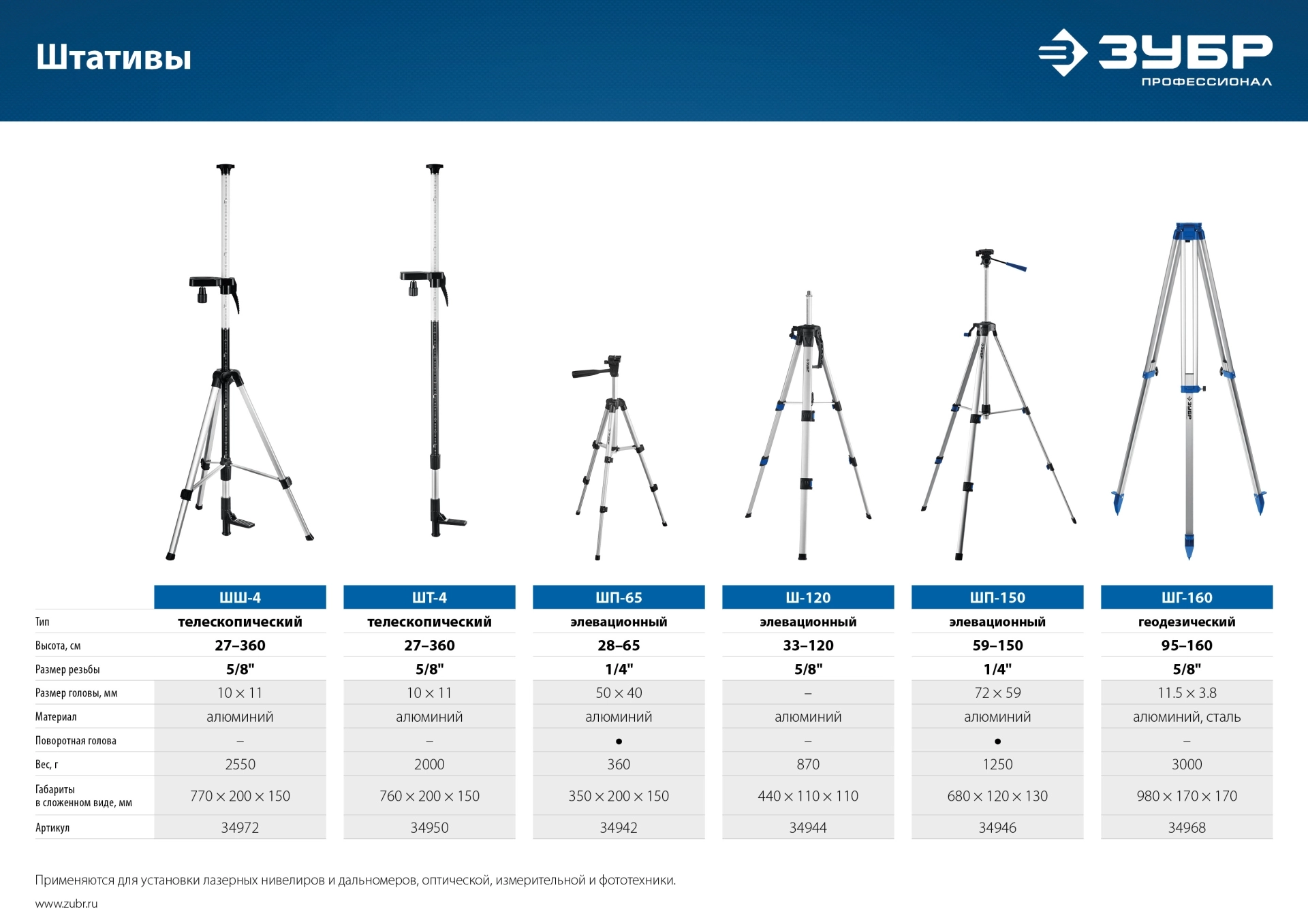 ПроизводителиШтатив геодезический, 95/160см, резьба 5/8" "ШГ 160" (34968) ЗУБР