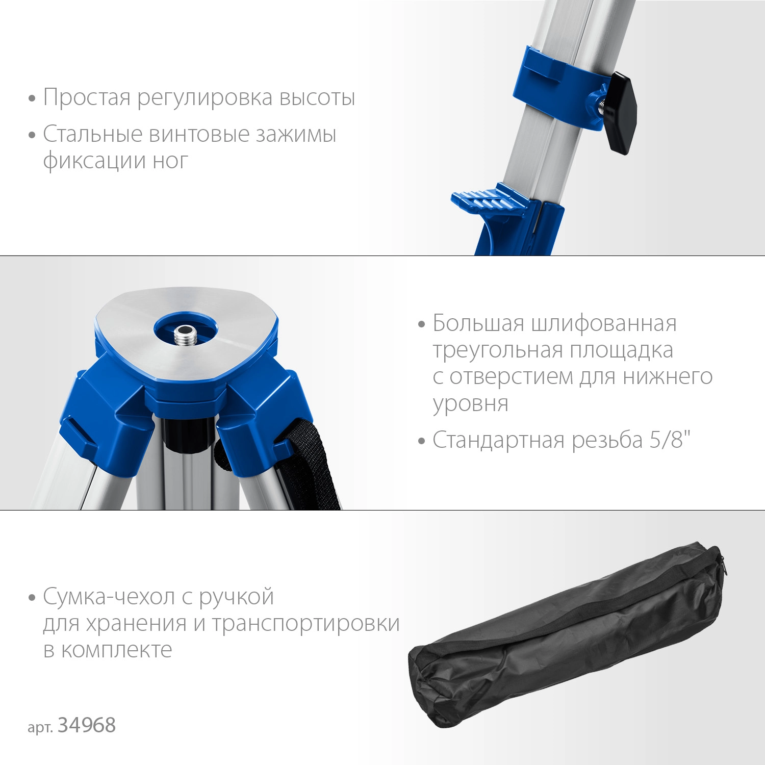 Профессиональный инструмент для работы с лазерным, оптическим, измерительным инструментом. Выполнен из алюминиевого сплава, благодаря чему имеет прочную конструкцию и оптимальный вес. Прибор можно точно установить на нужной высоте при помощи раздвижных ножек.