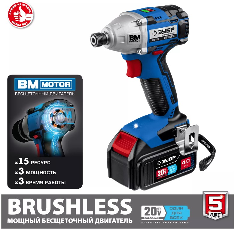 ХарактеристикиАртикул GVB-250-42Бренды ЗубрСтрана производства КитайАккумуляторная система ЗУБР Li-Ion PRO 20BТип винтовёртТип патрона 1/4"Количество скоростей 3Макс. крутящий момент 280Число оборотов холостого хода 2400Напряжение аккумулятора 20Число ударов 3300Скорость вращения 2400Емкость аккумулятора 4Индикация заряда батареи ДаТип аккумулятора Li-IonКейс в комплекте естьБыстросменный патрон НетАккумулятор в комплекте ДаВес 1700Питание аккумуляторКрутящий момент 280Кейс ДаДлина 370Ширина 110Блокировка шпинделя нетВысота 310Реверс естьПодсветка естьБесщеточный двигатель ДаВремя зарядки 30Способ крепления аккумулятора слайдерФиксация кнопки включения НетРегулировка крутящего момента 3Регулировка оборотов ДаОписание товара обновлено 08.12.2025 14:18:07Винтоверт Зубр GVB-250-42, предназначен для заворачивания/отворачивания крепежа (при сборке/разборке металлических конструкций, снятии/установке колес автомобиля и т.д.).Производитель: Крафтул И/Е Гмбх, Альтер Поствег Штр., Лоенинген, Германия