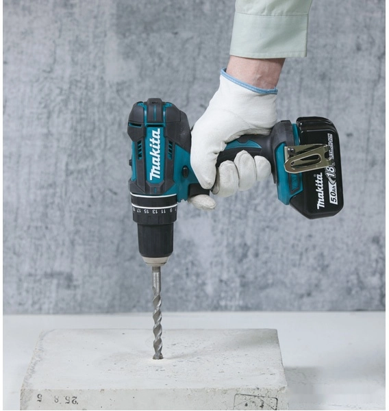 В инструмент Makita DHP482Z устанавливаются литиево-ионные блоки серии LXT с обозначением BL18XX. Первые цифры свидетельствует о высоком напряжении батареи – 18 В. Это означает приличную мощность привода, и действительно, максимальное значение крутящего момента в этой модели достигает 62 Нм. Инструмент пригоден для сверления отверстий в бетоне и стали диаметром до 13 мм. Это значение соответствует диаметру патрона этой дрели.