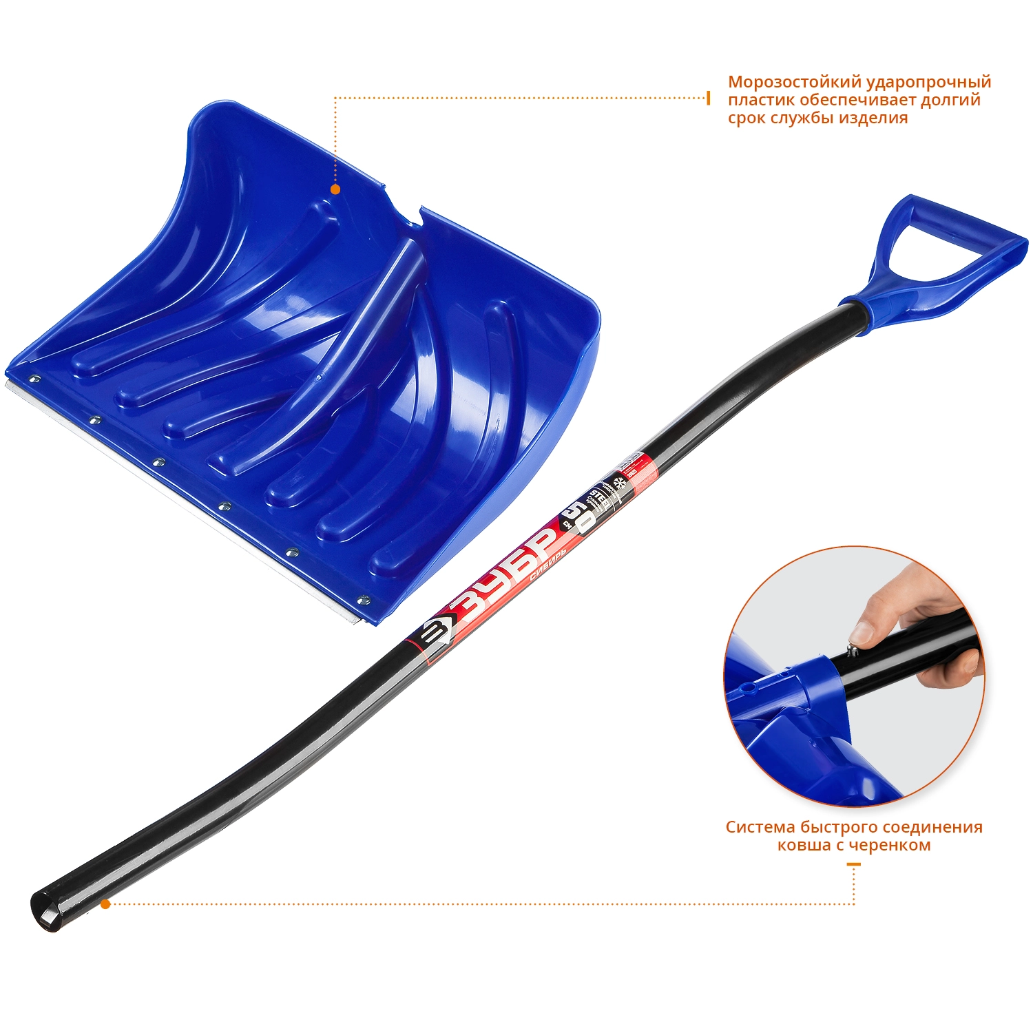 ПроизводителиЛопата снеговая, пласт. со стальной планкой, эргон. алюм. черенок, V-ручка, 500мм. (39925) ЗУБР
