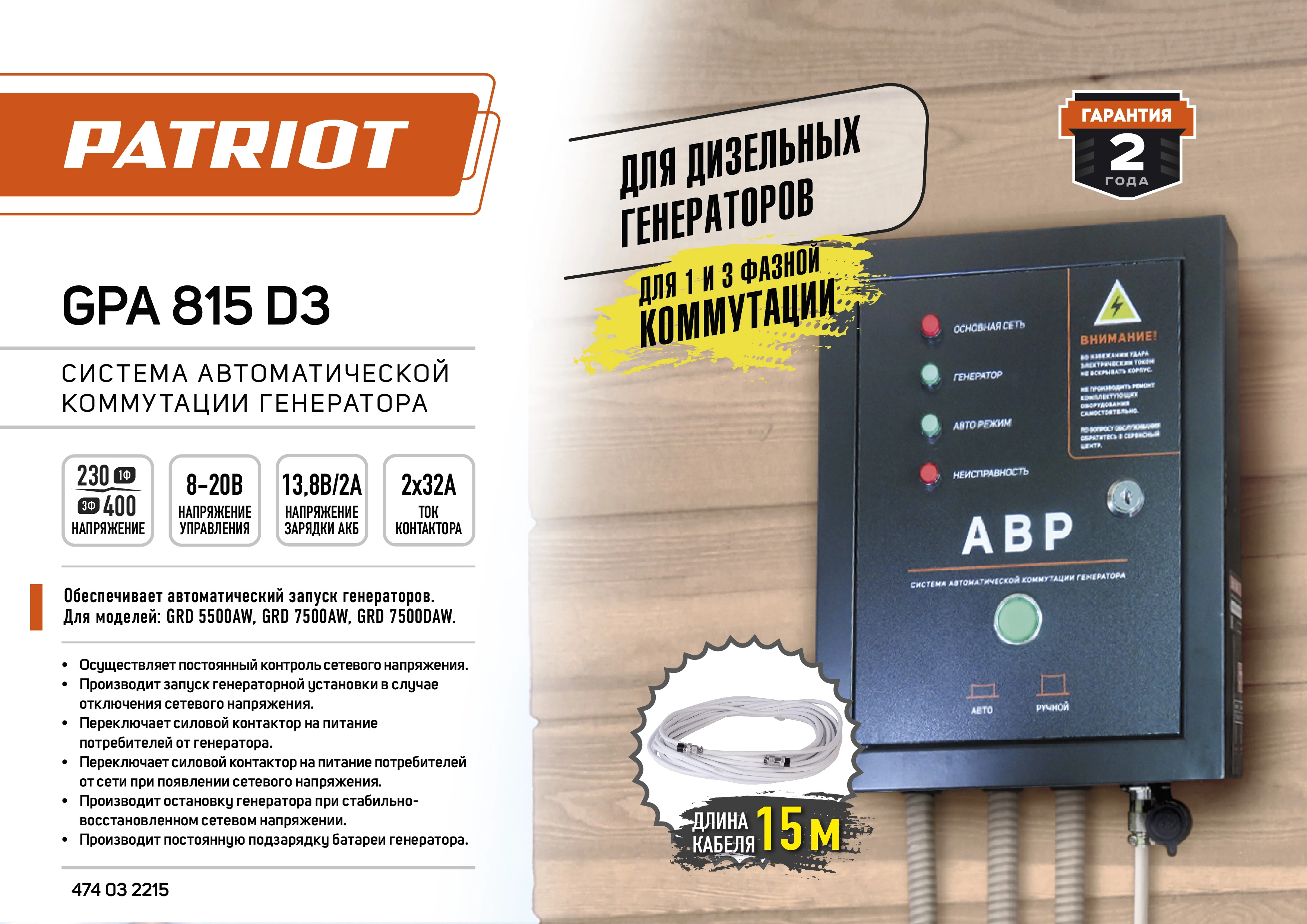 ПроизводителиСистема автоматической коммутации генератора GPA815D3 (220/380В 8/11 кВт 32А) PATRIOT / IMPERIAL
