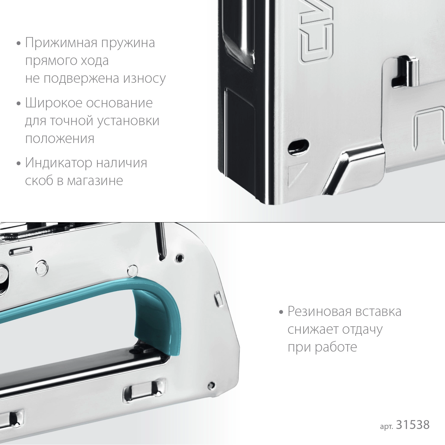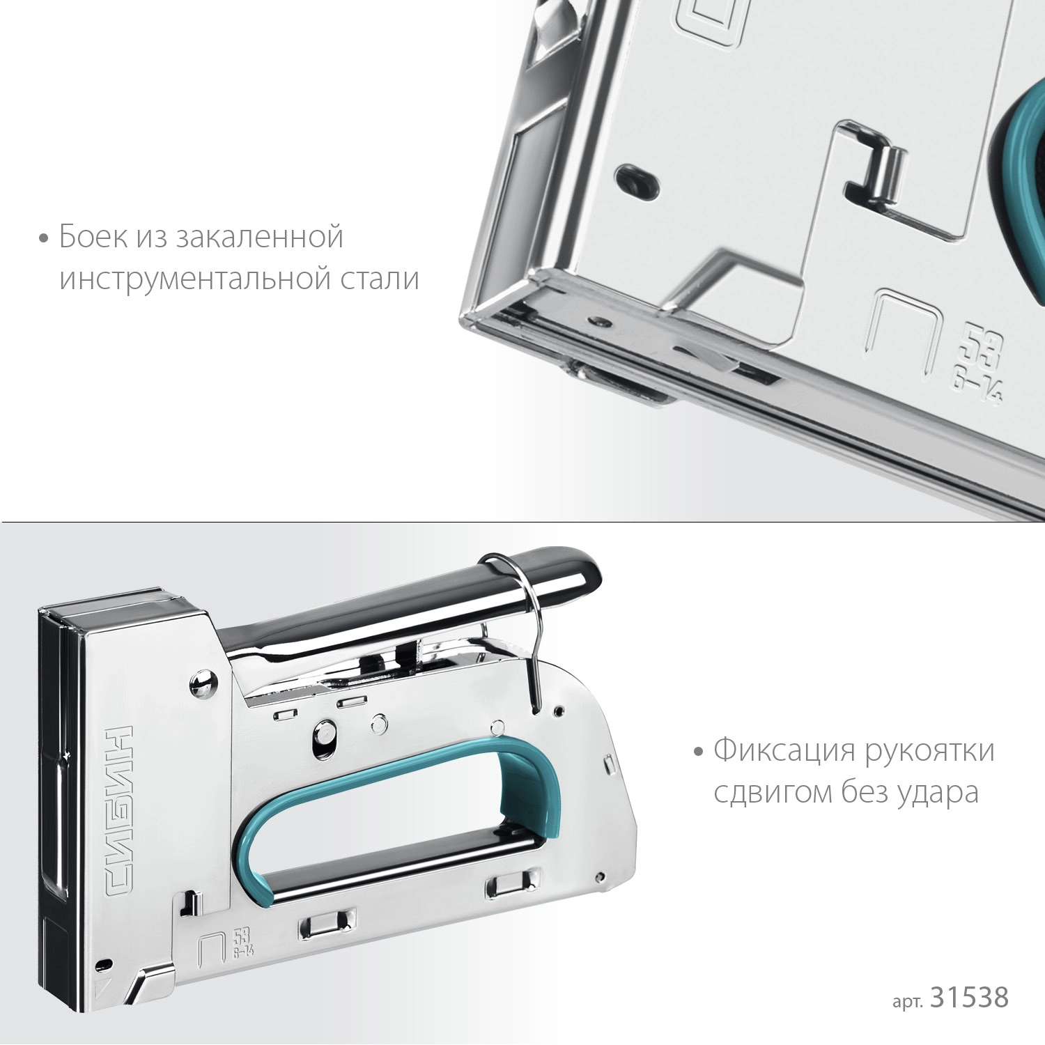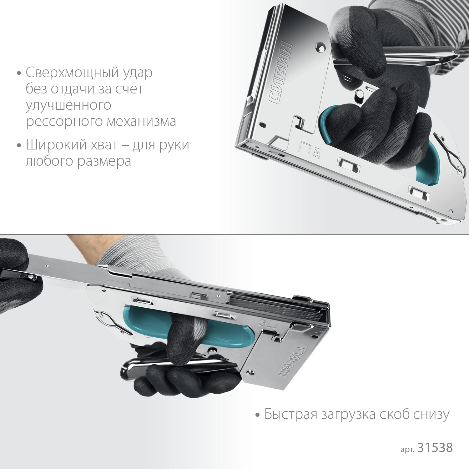 ПроизводителиСкобозабиватель ручной (степлер) регулируемый, тип 53 (A/10/JT21) 23GA, 6-14мм (31538) СИБИН